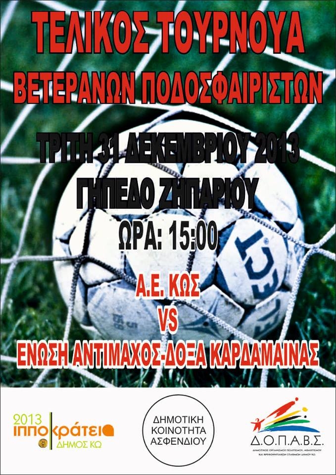 Την Τρίτη 31 Δεκεμβρίου στις 15:00 θα γίνει ο τελικός των βετεράνων στο γήπεδο Ζηπαρίου ανάμεσα στην Α.Ε Κω και την Ένωση Αντίμαχου-Καρδάμαινας.