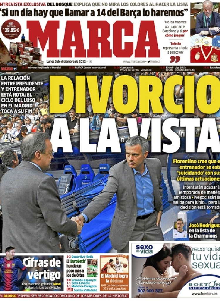 Σύμφωνα με δημοσίευμα της «Marca» στην έντυπη και ηλεκτρονική της μορφή, ο Ζοζέ Μουρίνιο δεν θα είναι στον πάγκο της Ρεάλ Μαδρίτης τη νέα χρονιά.