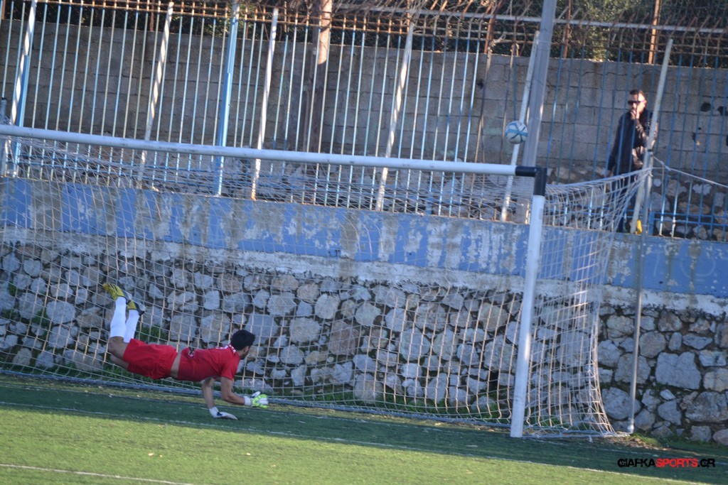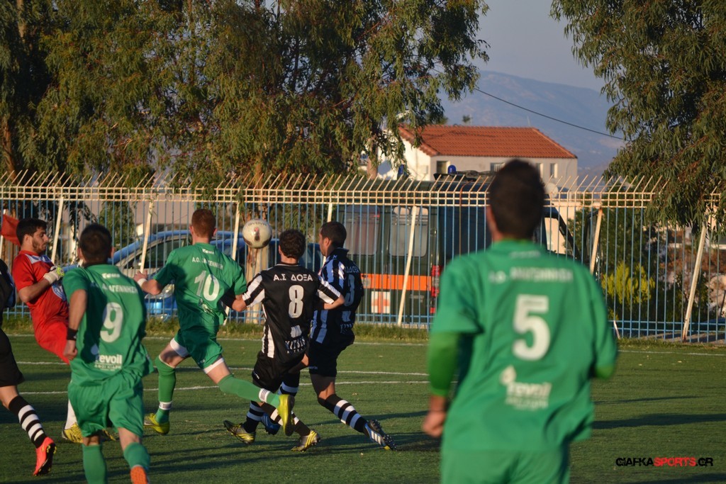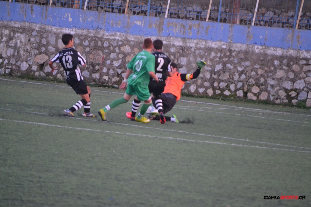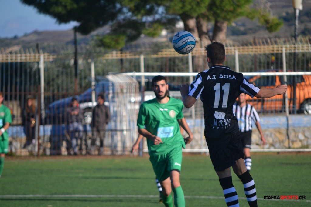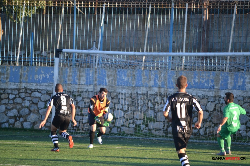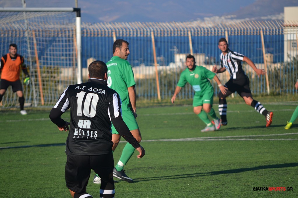 Μετά από αναγνωριστικό δεκάλεπτο στο ματς η Δόξα προσπάθησε να επιτεθεί από πλάγια για να διασπάσει την άμυνα της Αναγέννησης με τους “πράσινους” του Γιώργου Μηναϊδη να κλείνουν καλά τους διαδρόμους και να ψάχνουν στην κόντρα με τους Μάμμη, Βογιατζή και Εξήντα να πατήσουν την περιοχή του Μωραίτη. Στο 34′ λεπτό οι φιλοξενούμενοι κατάφεραν να ανοίξουν το σκορ όταν ο Χατζηπαναγιώτης σε κυνήγησε μια χαμένη μπαλιά απ’ τα αριστερά μπήκε στην περιοχή και κέρδισε το πέναλτι απ’ τους αμυντικούς της Δόξας με τον Πη να ευστοχεί απ’ την άσπρη βούλα για το 0-1. Η Αναγέννηση προσπάθησε να απαντήσει άμεσα αλλά το δυνατό σουτ του Γεροβασίλη λίγα λεπτά αργότερα έδιωξε εντυπωσιακά ο Μωραίτης σε κόρνερ.