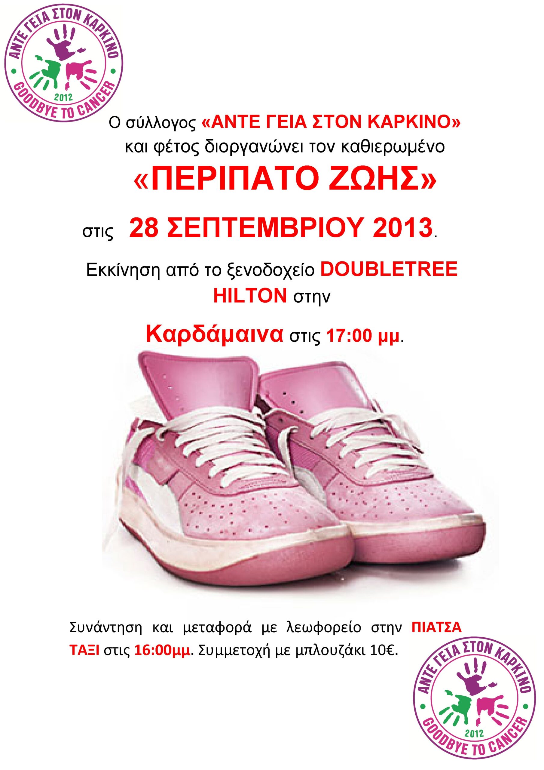 Ο σύλλογος «Άντε γεια στον καρκίνο» σας προσκαλεί το Σάββατο 28 Σεπτεμβρίου 2013 στον «Περίπατο Ζωής». Η εκκίνηση θα δοθεί στο ξενοδοχείο Doubletree Hilton στην Καρδάμαινα στις 17:00. Θα υπάρχει λεωφορείο από την πιάτσα Ταξί στην Καρδάμαινα για να μεταφέρει κόσμο στο σημείο εκκίνησης στις 16:00.