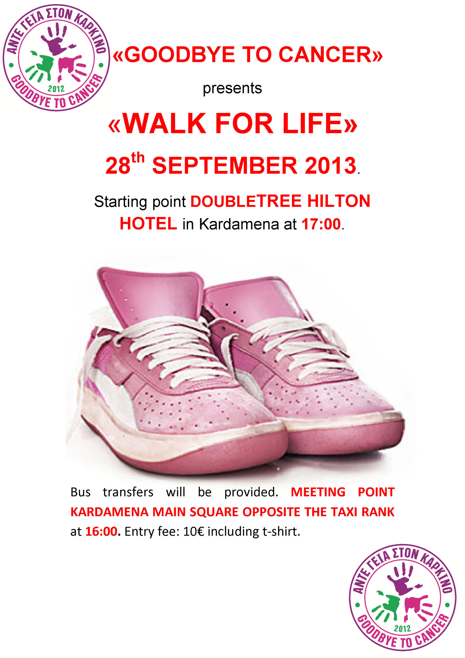 Ο σύλλογος «Άντε γεια στον καρκίνο» σας προσκαλεί το Σάββατο 28 Σεπτεμβρίου 2013 στον «Περίπατο Ζωής». Η εκκίνηση θα δοθεί στο ξενοδοχείο Doubletree Hilton στην Καρδάμαινα στις 17:00. Θα υπάρχει λεωφορείο από την πιάτσα Ταξί στην Καρδάμαινα για να μεταφέρει κόσμο στο σημείο εκκίνησης στις 16:00.