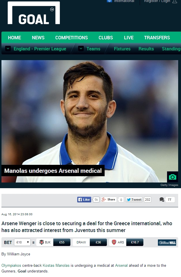 Κεντρικό δημοσίευμα στο «goal.com» αναφέρει πως ο Κώστας Μανωλάς είναι στο Λονδίνο και περνάει από ιατρικές εξετάσεις στην Άρσεναλ.