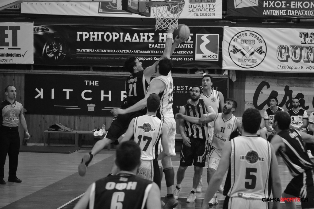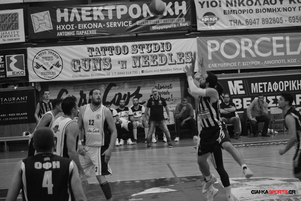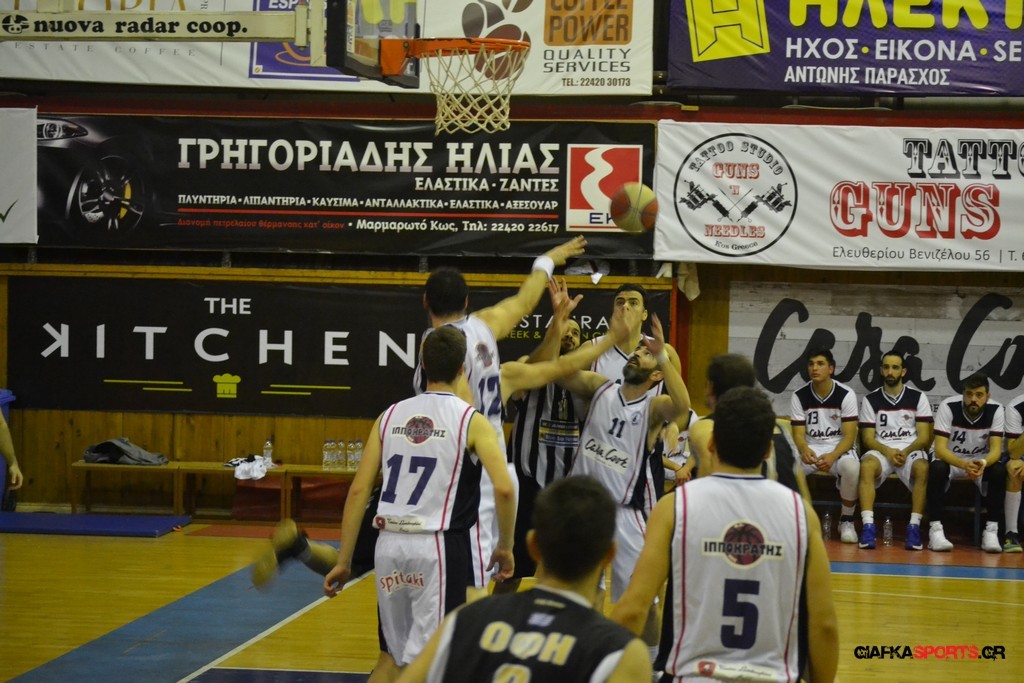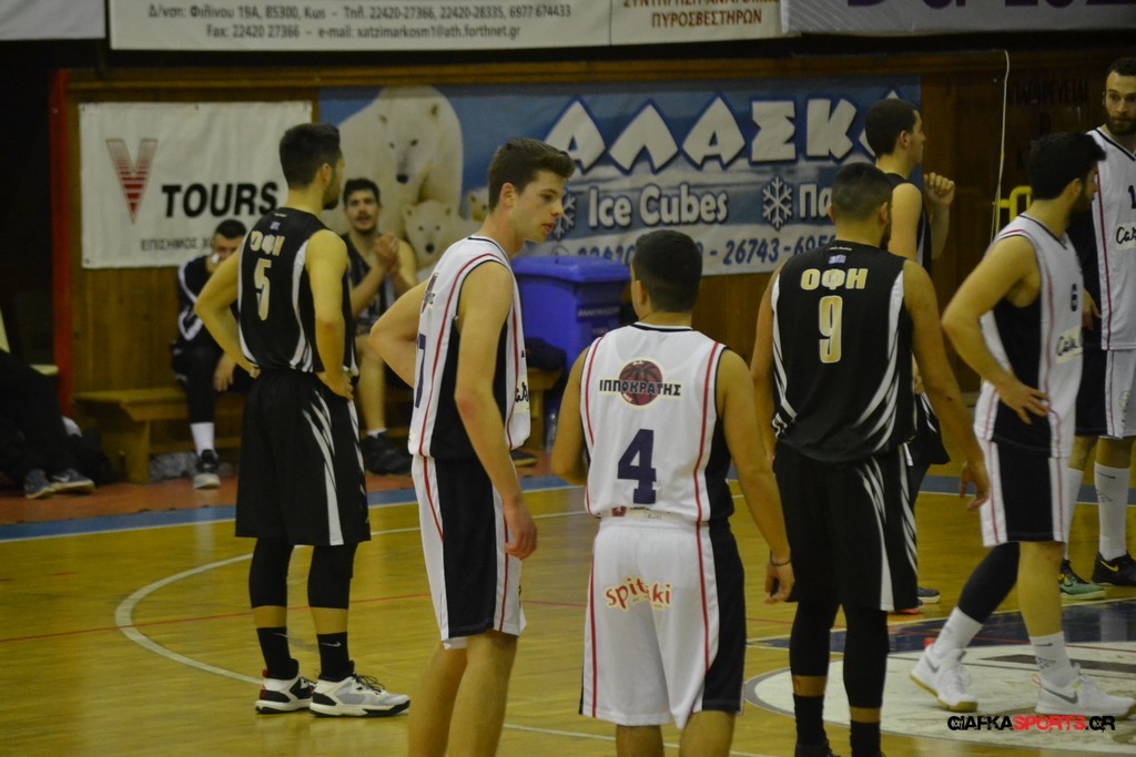 Το είχαμε πει… Ο Ιανουάριος θα δώσει την άνοδο στον Ιπποκράτη, και η κωακή τηρεί κατά γράμμα και κατά… αγώνα το χρονοδιάγραμμα της επιτυχίας. Η ομάδα του Μιχάλη Καπλανίδη κέρδισε σχετικά άνετα και τον Ο.Φ.Η. με 78-64 και συνεχίζει την επιτυχημένη πορεία της, που την οδηγεί με μαθηματικά ακρίβεια στη Β’ Εθνική. Οι Κώοι εκμεταλλεύθηκαν πλήρως τον παράγοντα έδρα, ήταν σαφώς καλύτεροι και όσες φορές έβαλαν δύσκολα στον… εαυτό τους, κατάφεραν να δείξουν χαρακτήρα και να πάρουν τη νίκη. Με τους συνήθεις ύποπτους σε πολύ καλή μέρα (Ασημακόπουλος, Χαρίσης, Τρύπας), τον Κουκουράβα να είναι πολύ ανεβασμένος και τον Χρήστου να αποτελεί την ευχάριστη έκπληξη, ο Ιπποκράτης ανέβασε στροφές μετά το α’ δεκάλεπτο. Στην αρχή οι Κρητικοί με τους Ξενάκη, Αγαπιάδη και Μπούμπαρη δυσκόλεψαν τον Ιπποκράτη (6-4 στο 4’ και 12-13 στο 8’), αλλά στο β’ δεκάλεπτο οι Κώοι ανέβασαν στροφές. Το 20-16 έγινε 32-16 (16’), με τον Ο.Φ.Η. να μένει άποντος για έξι λεπτά, αλλά να επιστρέφει (35-21 στο 18’) και να μειώνει σε 37-27 στο ημίχρονο. Οι Κρητικοί μάλιστα ήταν απειλητικοί στο γ’ δεκάλεπτο (39-34 στο 24’ και 43-37 στο 26’), αλλά στη συνέχεια ο Ιπποκράτης έδειξε το πραγματικό του πρόσωπο, ξέφυγε με +10 (63-53 στο 33’), με +14 (68-54 στο 36’), με +20 (74-54 λίγο πριν το τέλος) και έφτασε σχετικά άνετα σε μία ακόμη νίκη, στο παιχνίδι με το οποίο άνοιξε η αυλαία της 13ης αγωνιστικής στον 2ο όμιλο νότου της Γ’ Εθνικής. Εξαιρετική παρουσία από τον Ο.Φ.Η. άφησε ο 17χρονος Βλαχάκης…