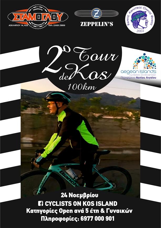 Ένας ακόμα αγώνας ποδηλασίας θα πραγματοποιηθεί την Κυριακή 24 Νοεμβρίου στην Κω από τον Κωακό Αθλητικό Όμιλο «Φιλίνος» με συνδιοργανώτρια την Περιφέρεια Νοτίου Αιγαίου. Ο αγώνας είναι 100 χιλιομέτρων, τελεί υπό την αιγίδα της Ομοσπονδίας Ποδηλασίας και ανήκει στο καλεντάρι της, κάτι που σημαίνει πως οι αθλητές βαθμολογούνται για να κατηγοριοποιηθούν στο τέλος της χρονιάς.