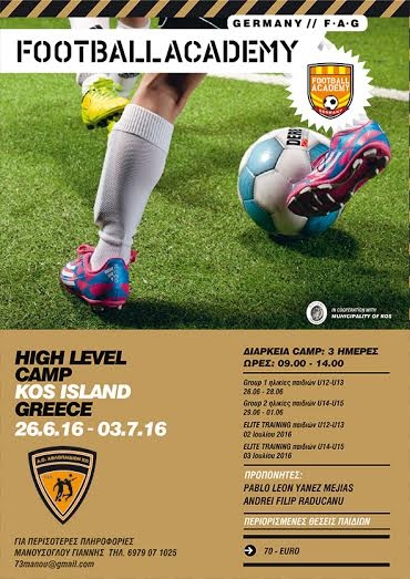 Η σχολή ποδοσφαίρου του Α.Ο. Αθλοπαιδιών Κω, με την ευγενική υποστήριξη του Δήμου Κω, διοργανώνει στο Νέο Στάδιο Ανταγόρας από 26 Ιουνίου έως 1 Ιουλίου 2016, προπονητικό πρόγραμμα για ποδοσφαιριστές που έχουν γεννηθεί τα έτη 2001, 2002, 2003, 2004.