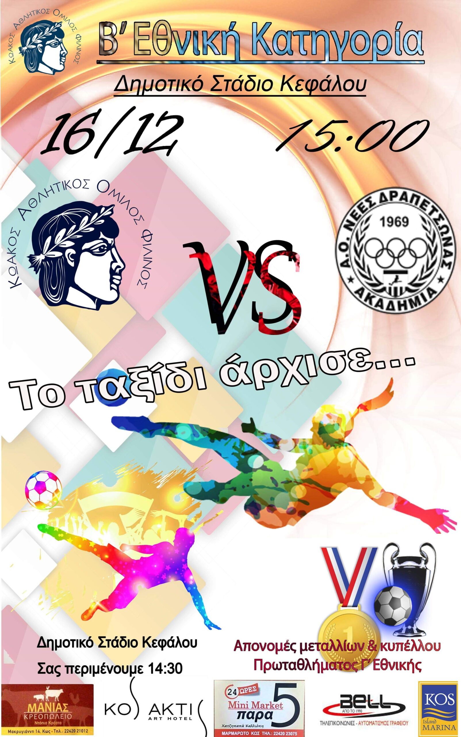 στον εντός έδρας αγώνα για το πρωτάθλημα της Β’ Εθνικής που θα γίνει στην Κέφαλο με την ομάδα Νέοι Δραπετσώνας.