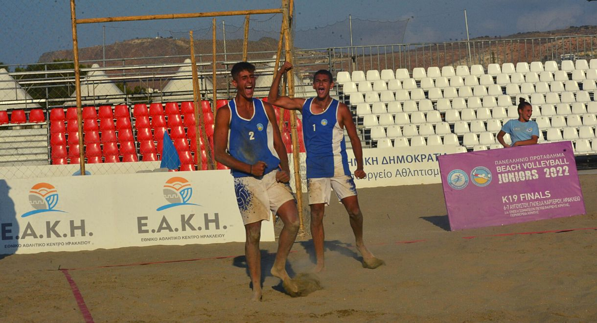 Ο Γιάννης Καρδούλιας (από την Κω) και ο Δημήτρης Καλιόζης (από τη Ρόδο) έκαναν το… νταμπλ στα αναπτυξιακά πρωταθλήματα μπιτς βόλεϊ καθώς μετά τον τίτλο στο Κ22, κατέκτησαν και το πρωτάθλημα Κ19 που ολοκληρώθηκε στις εγκαταστάσεις του Karteros Beach Sports Center. Στον τελικό βρέθηκαν αντιμέτωποι με τους πρωταθλητές Ελλάδας Κ17 Κυριάκο Κεσκίνη, Ανδρέα Κοντοστάθη τους οποίους νίκησαν με 2-0 (21-12, 21-17) επιβεβαιώνοντας τα προγνωστικά. Ο τελικός των αγοριών δεν είχε ανάλογο σασπένς με αυτόν των γυναικών αν και στο δεύτερο σετ είχαμε μια μεγάλη ανατροπή.
