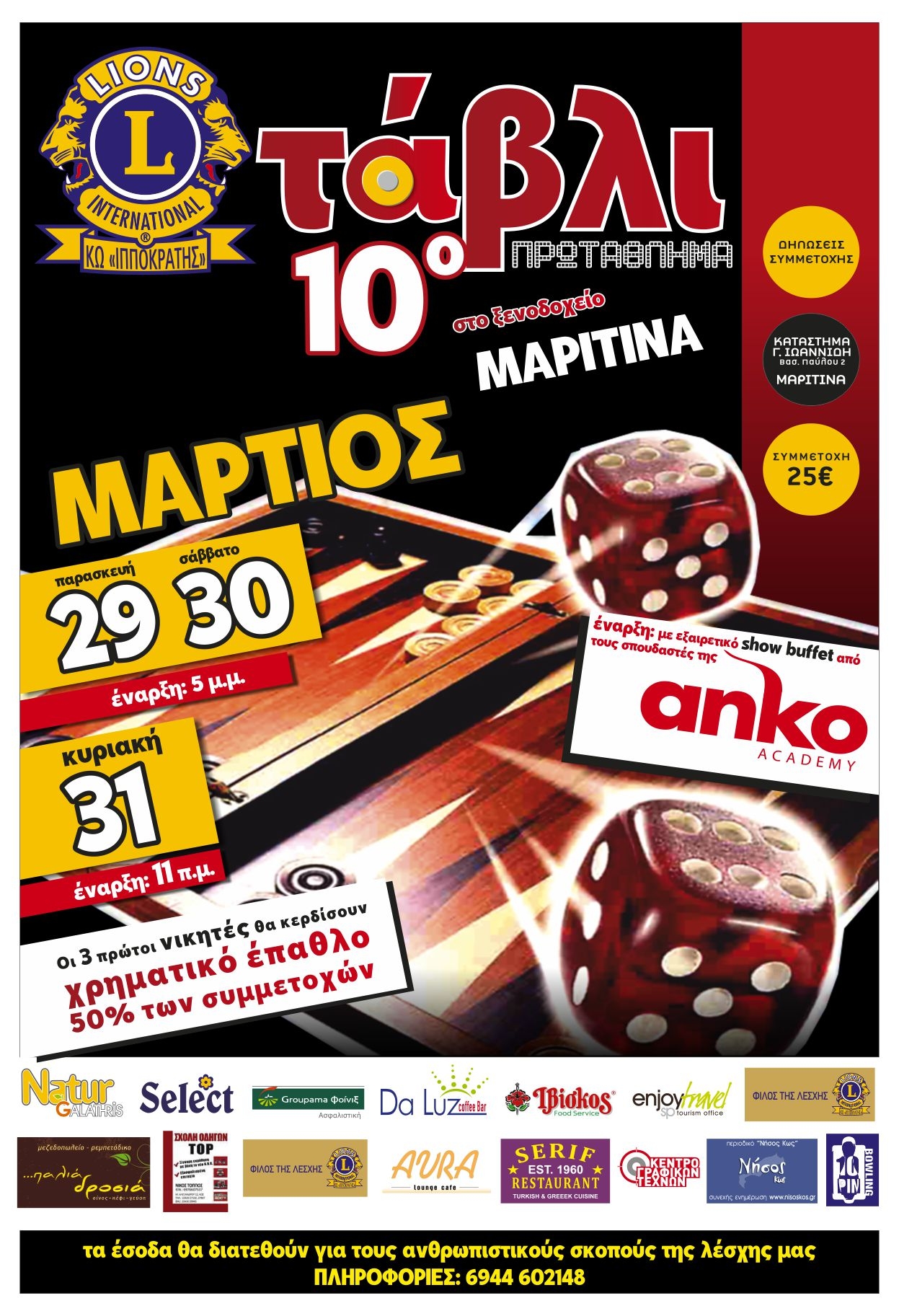Για δέκατη συνεχή χρονιά, η λέσχη LIONS ΚΩ «ΙΠΠΟΚΡΑΤΗΣ», διοργανώνει το γνωστό σε όλους, πρωτάθλημα τάβλι.
