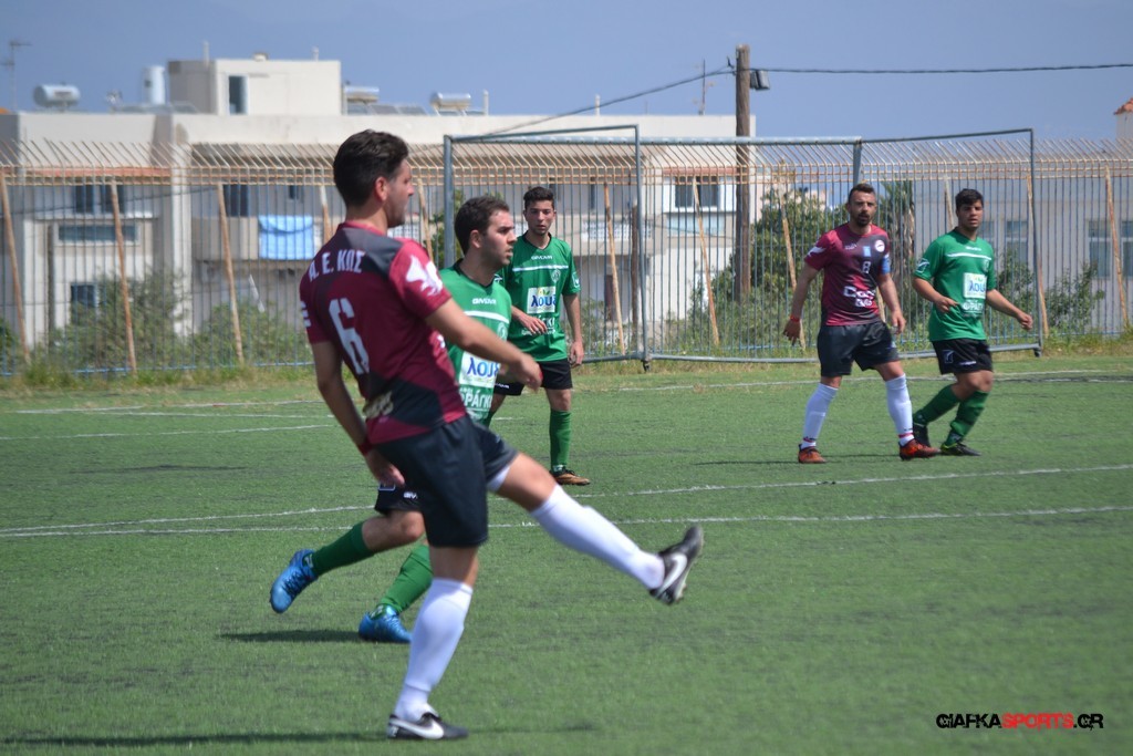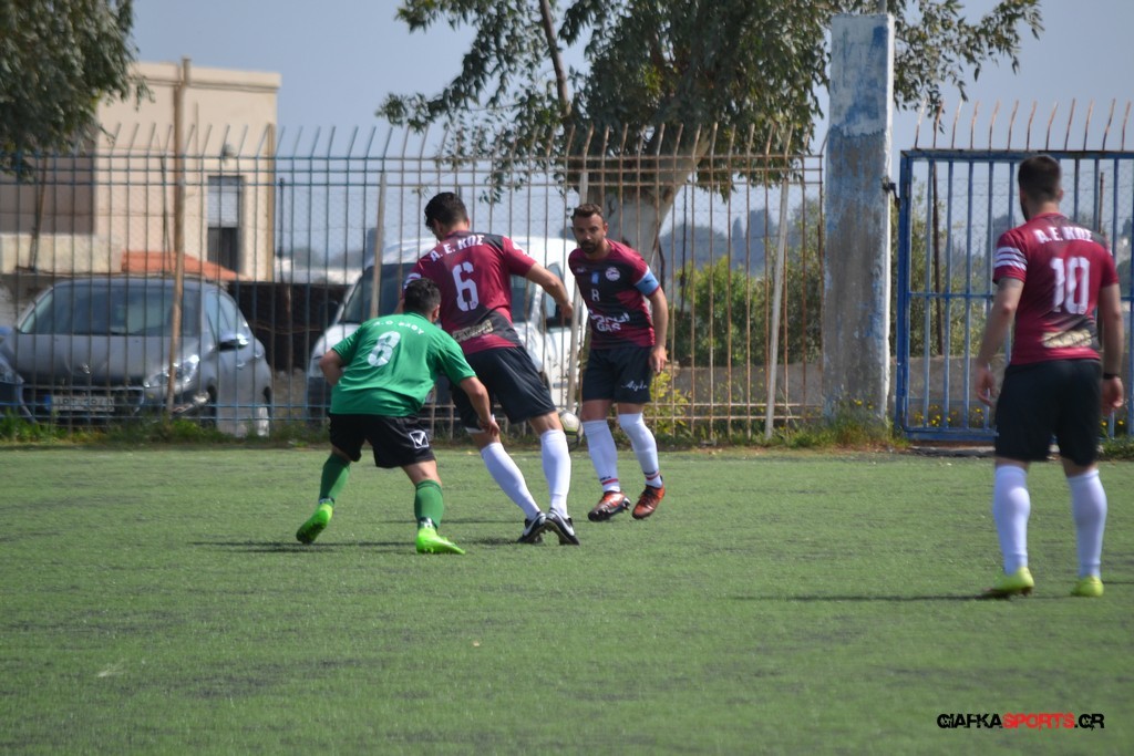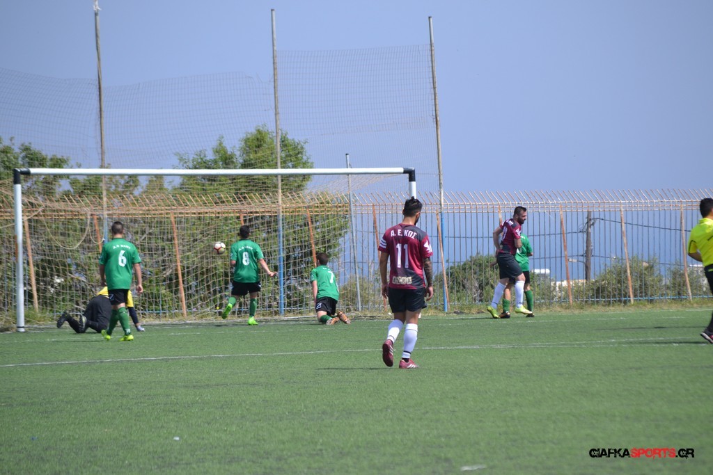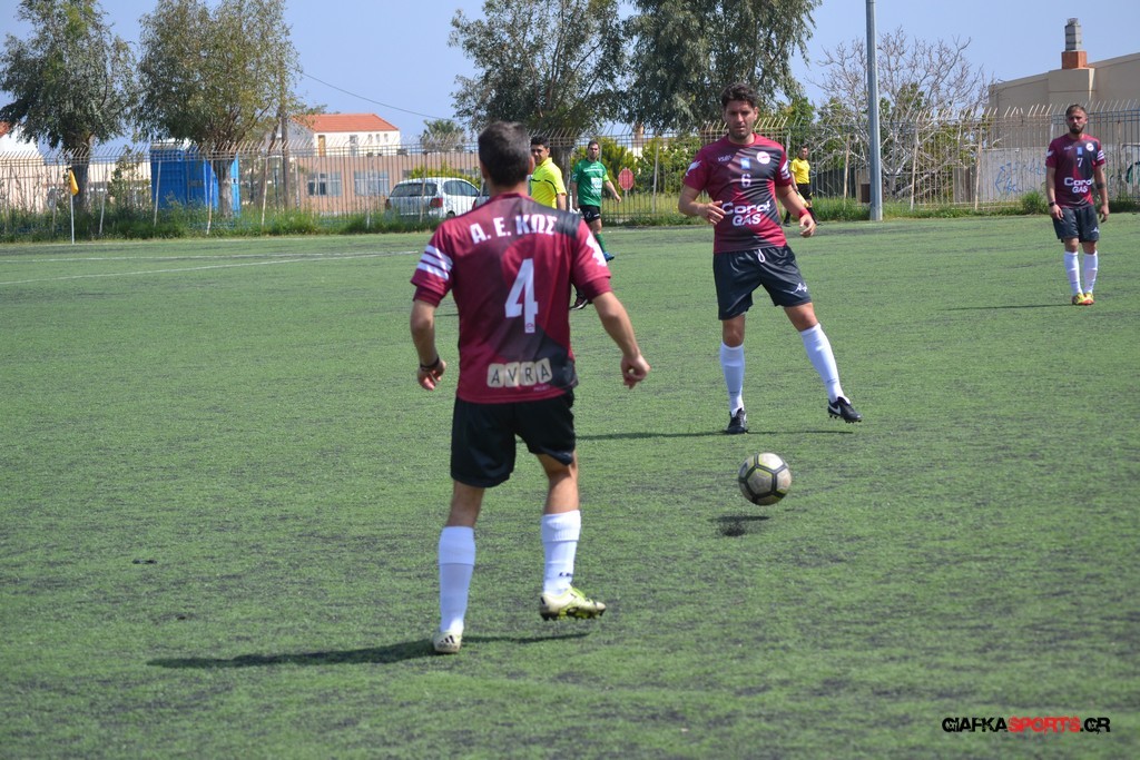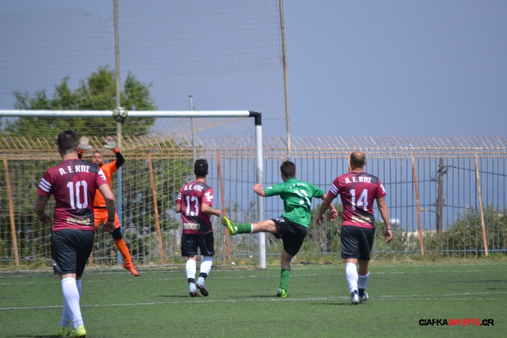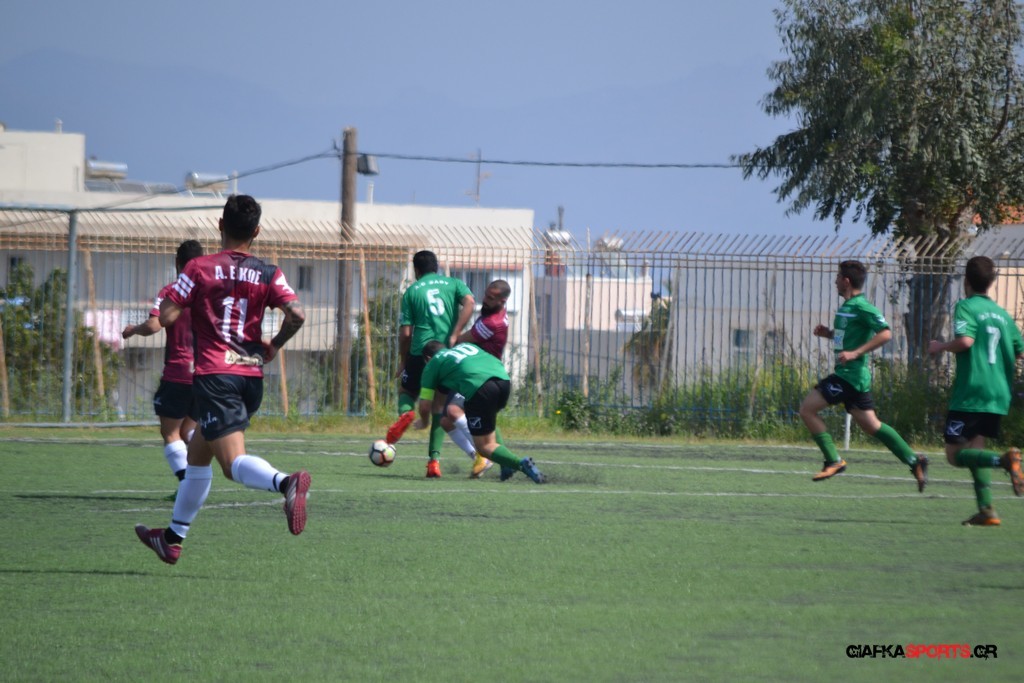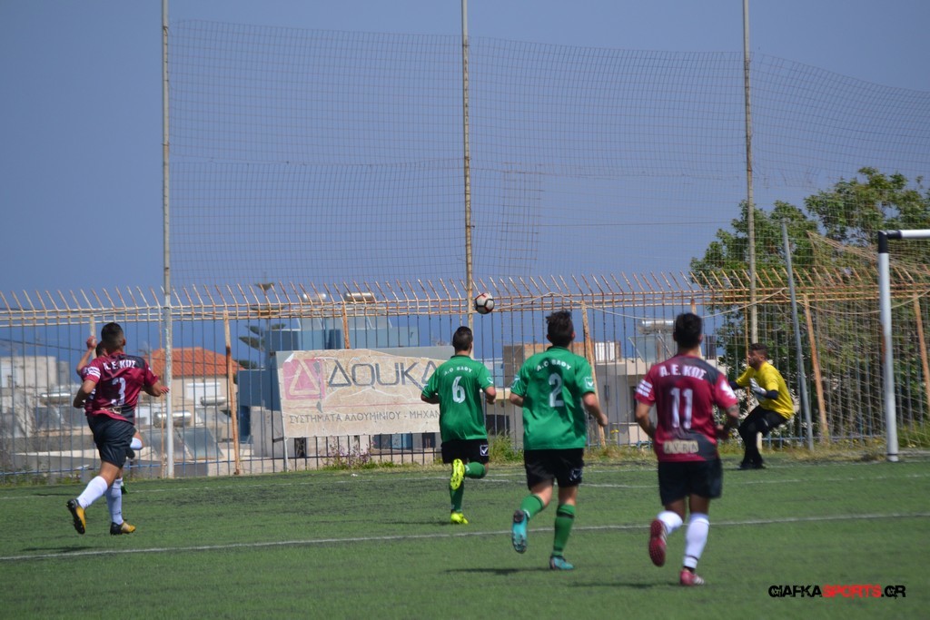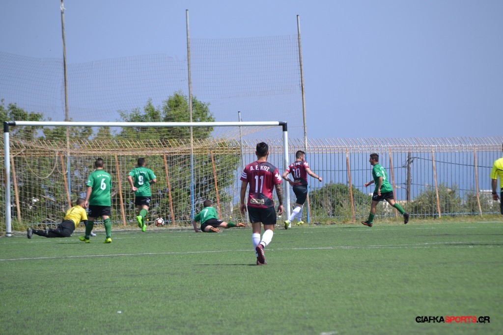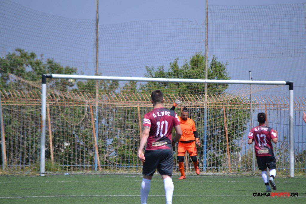 Η Α.Ε Κως είχε τον έλεγχο και την κυκλοφορία και στο 32’ ο Βασιλειάδης με το στήθος έσπρωξε την μπάλα στα δίχτυα κάνοντας το 3-0 για την ομάδα του που ήταν το αποτέλεσμα του πρώτου ημιχρόνου.