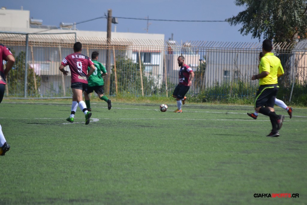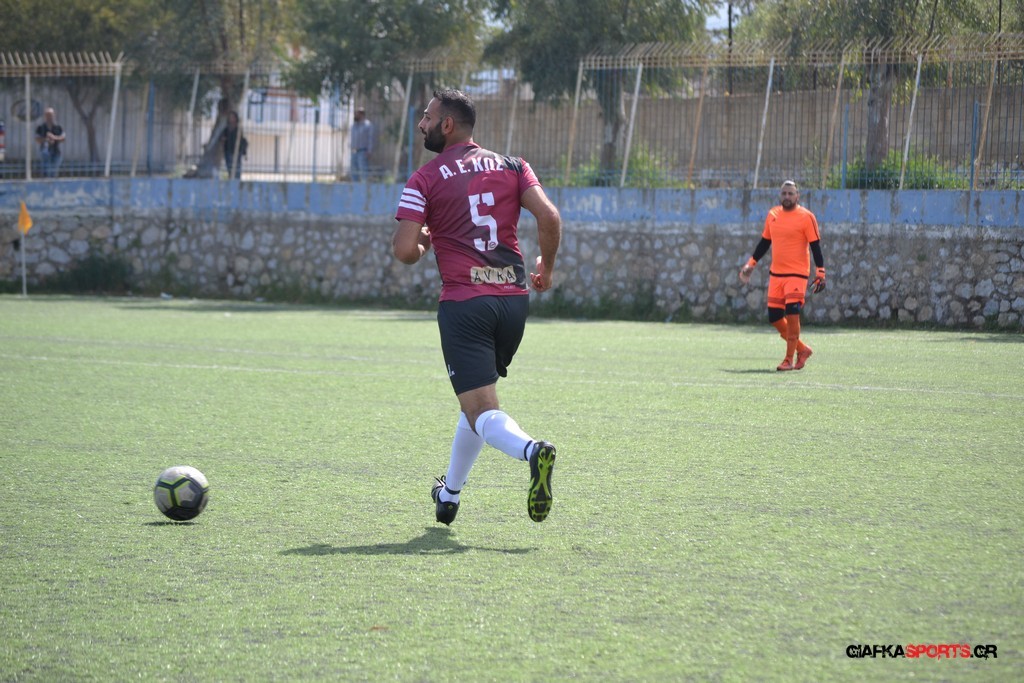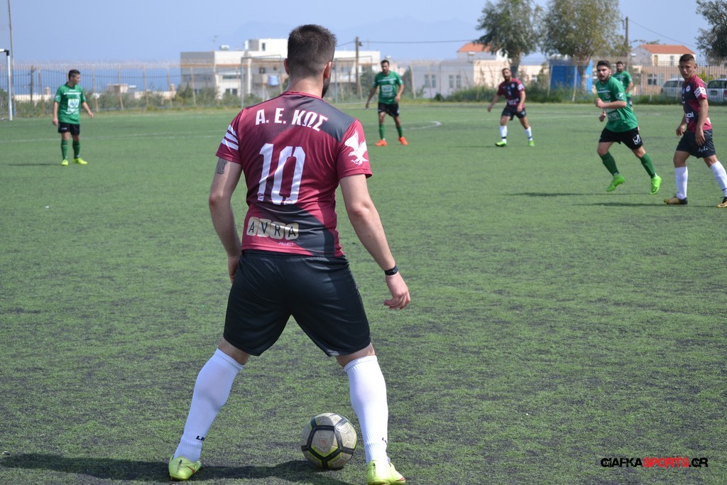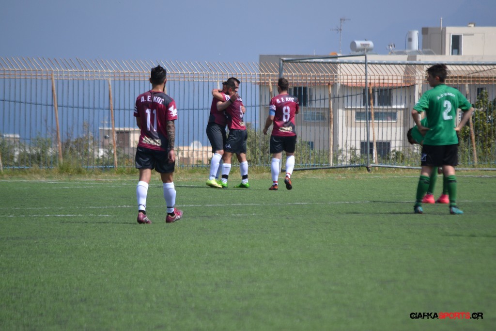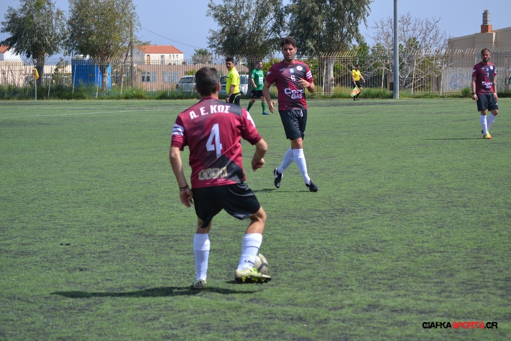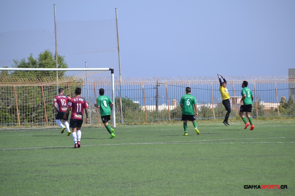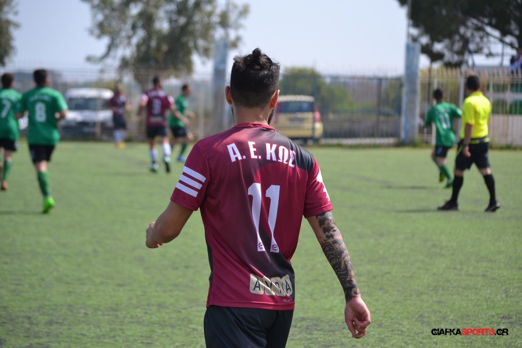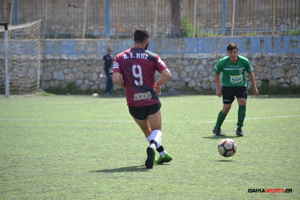 Η Α.Ε Κως είχε τον έλεγχο και την κυκλοφορία και στο 32’ ο Βασιλειάδης με το στήθος έσπρωξε την μπάλα στα δίχτυα κάνοντας το 3-0 για την ομάδα του που ήταν το αποτέλεσμα του πρώτου ημιχρόνου.