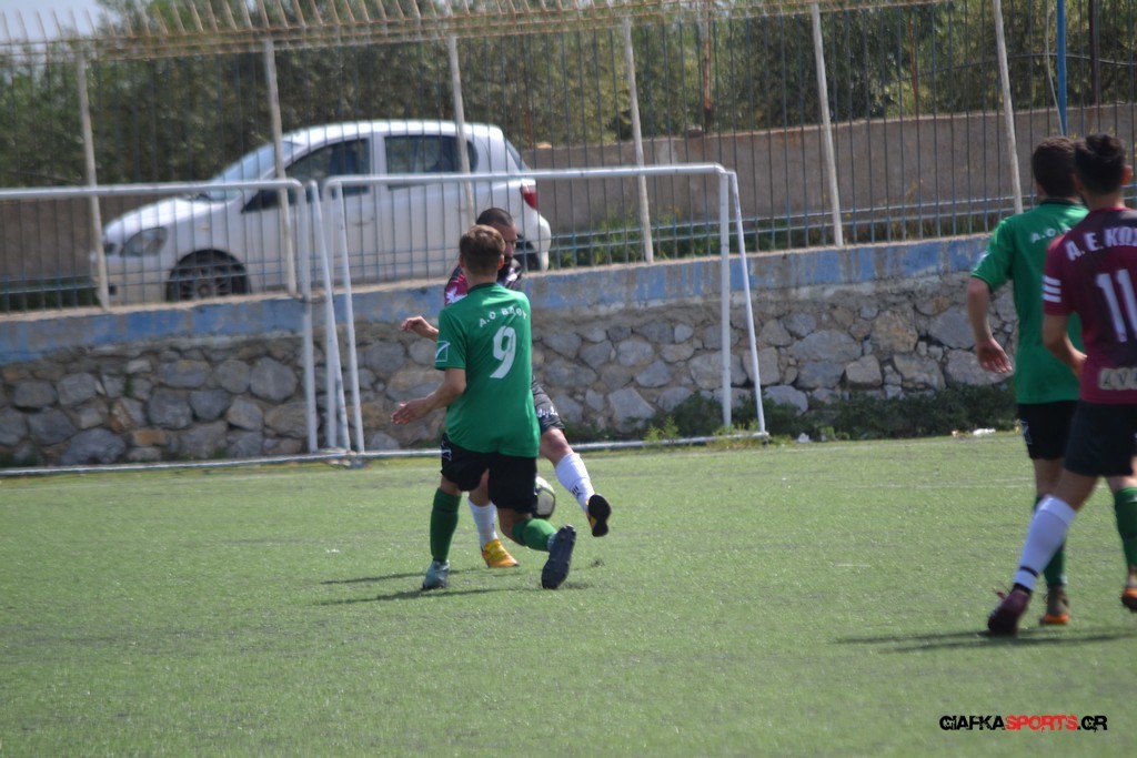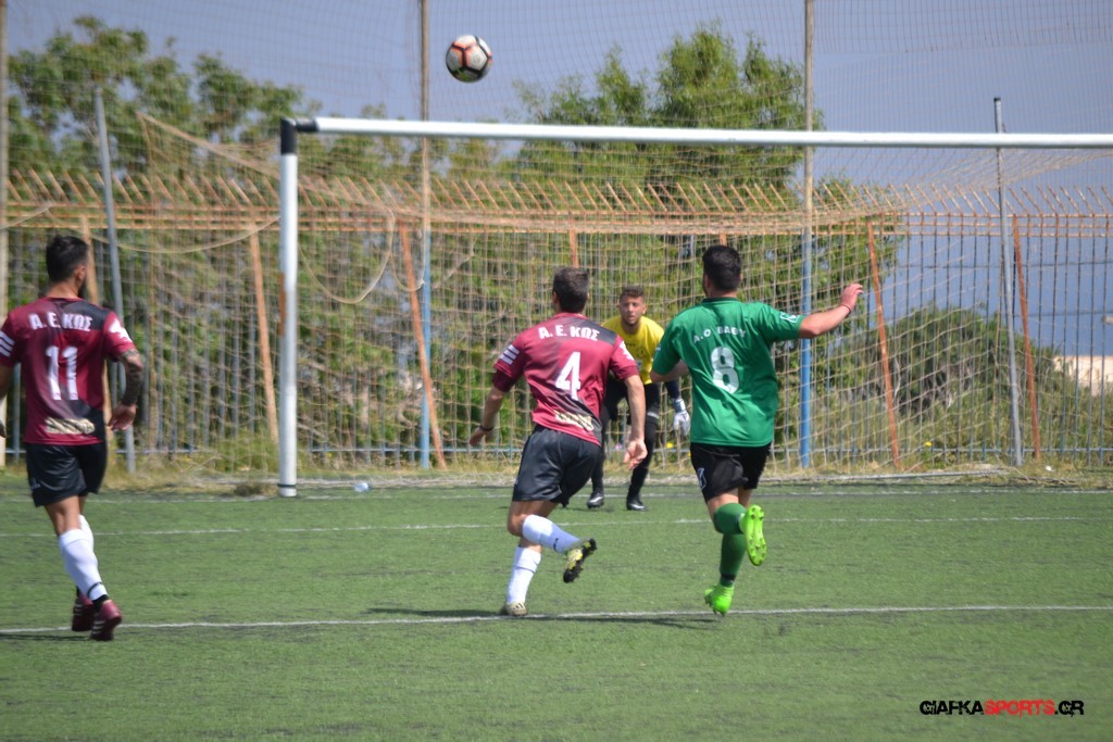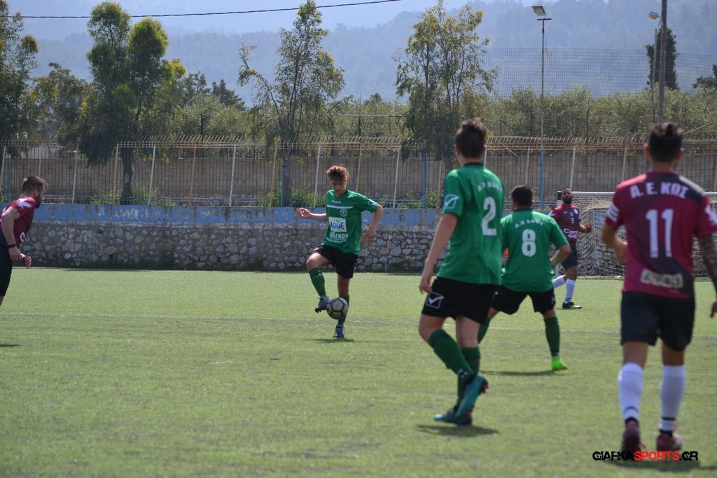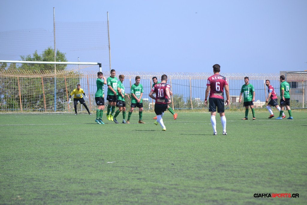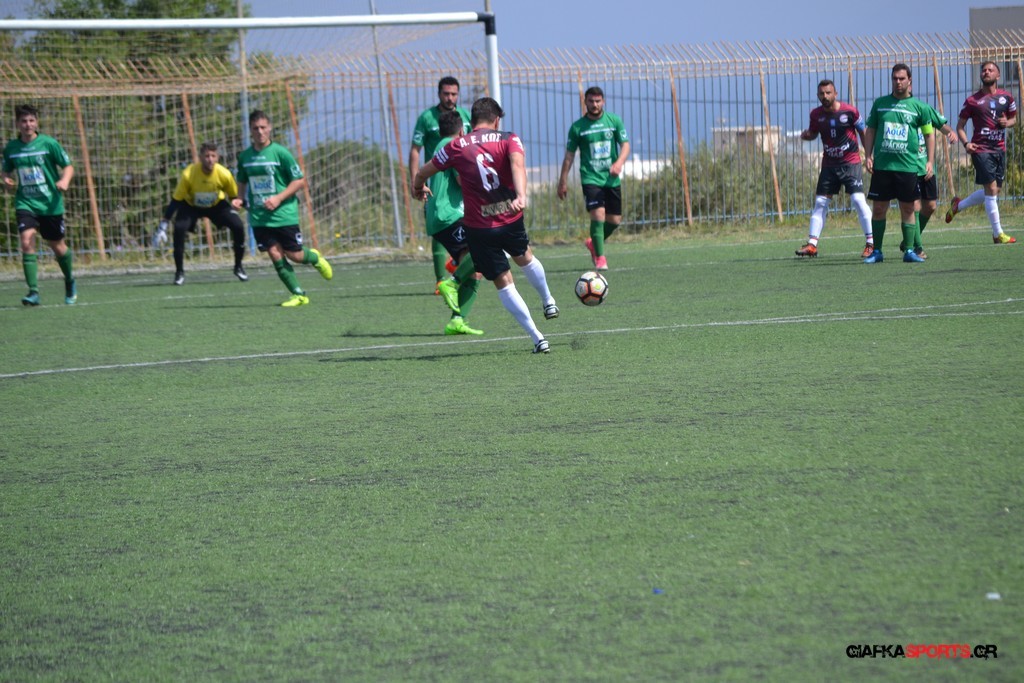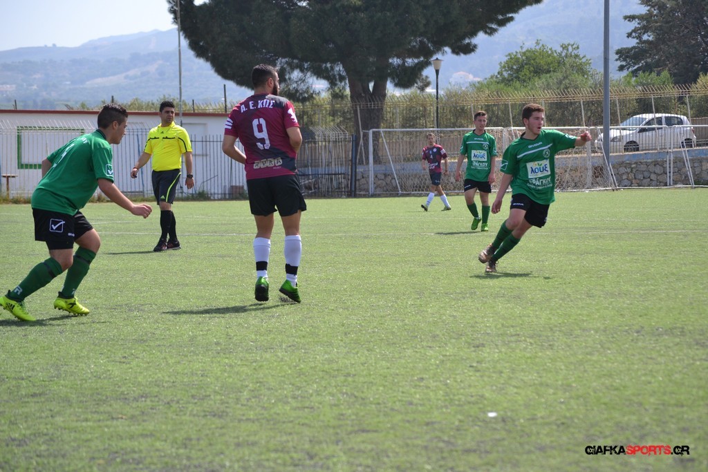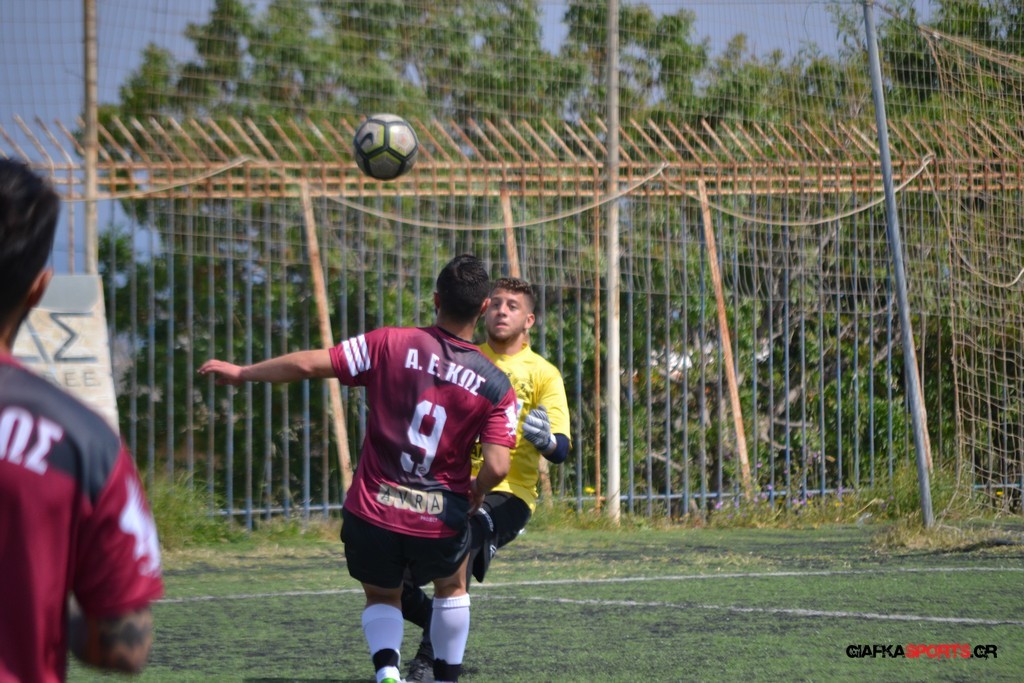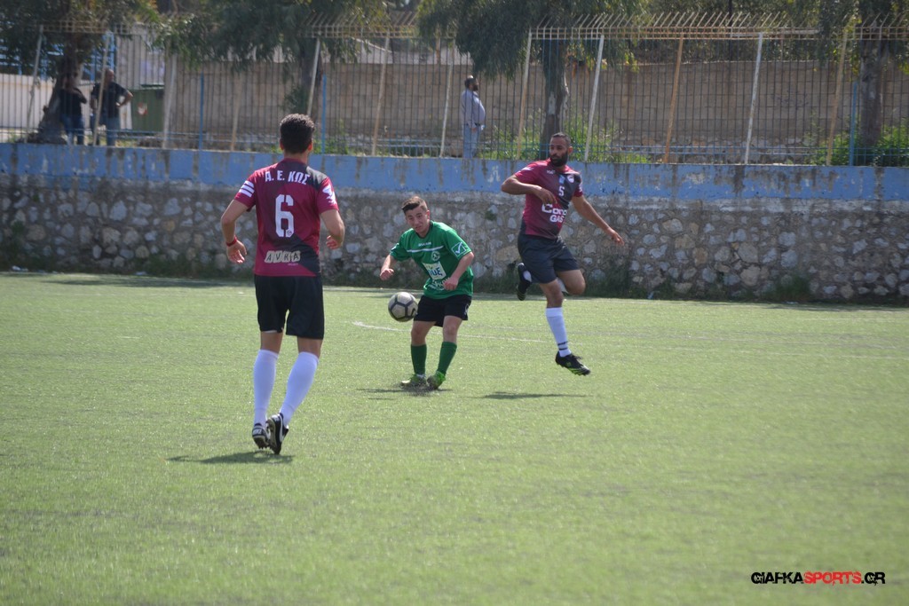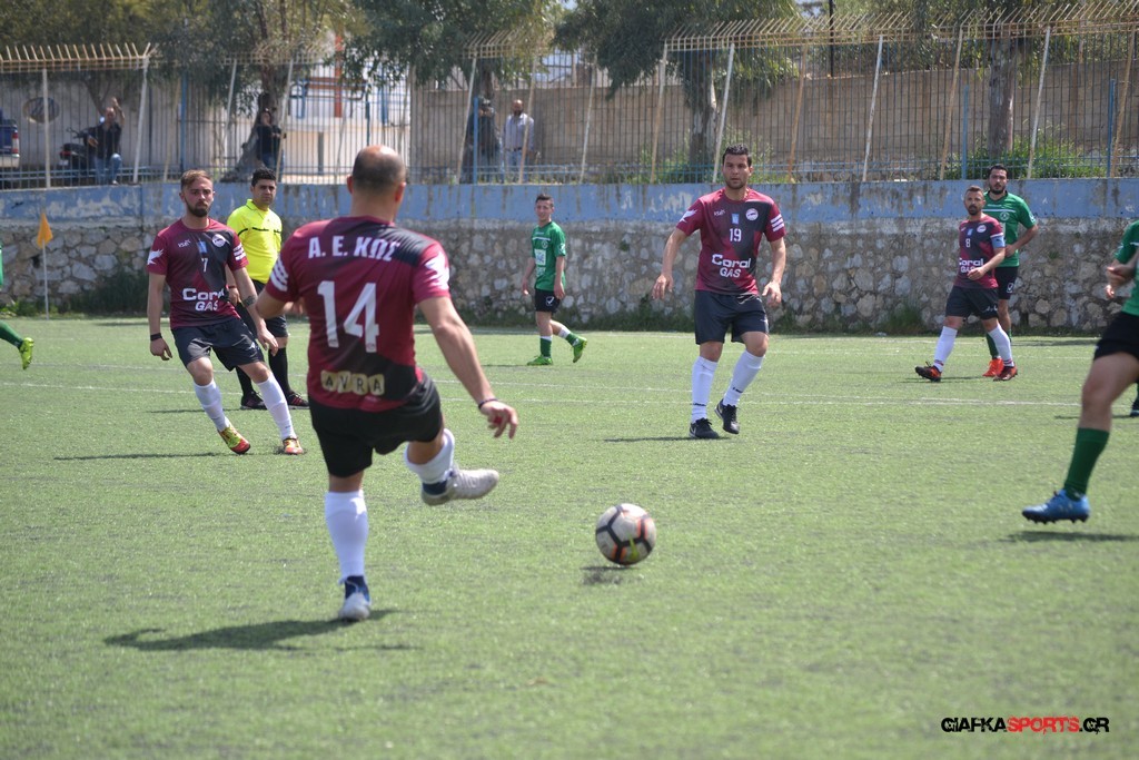 Η Α.Ε Κως είχε τον έλεγχο και την κυκλοφορία και στο 32’ ο Βασιλειάδης με το στήθος έσπρωξε την μπάλα στα δίχτυα κάνοντας το 3-0 για την ομάδα του που ήταν το αποτέλεσμα του πρώτου ημιχρόνου.