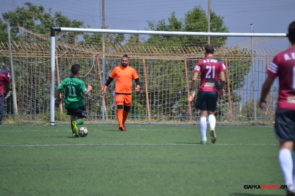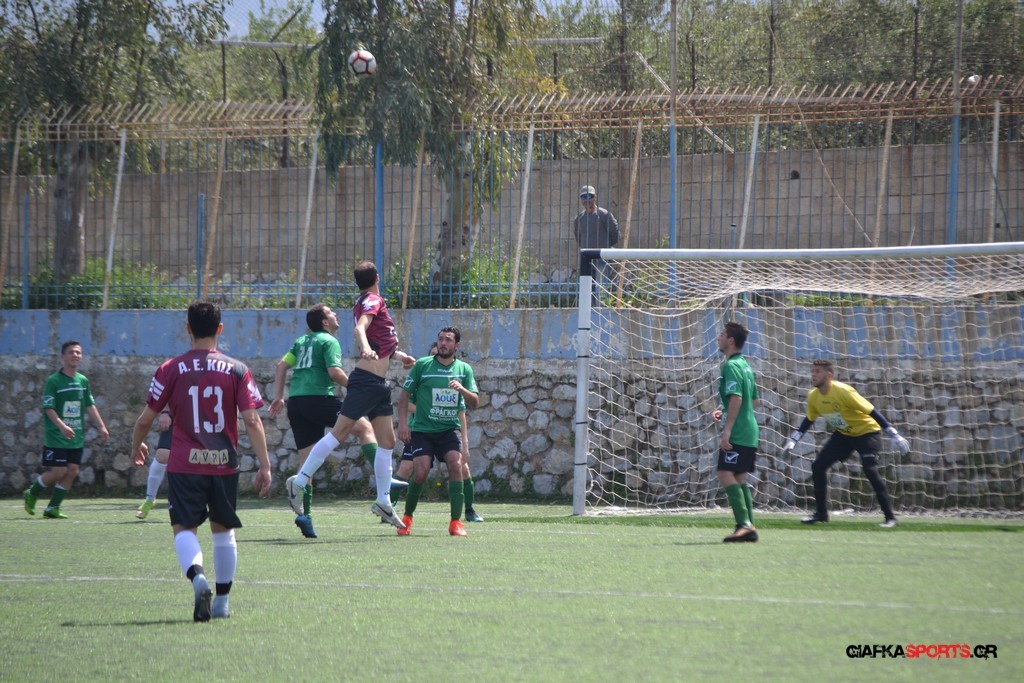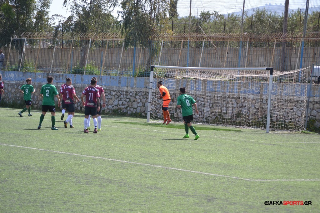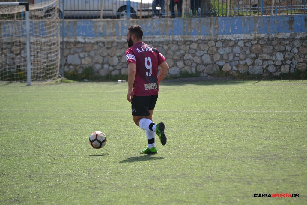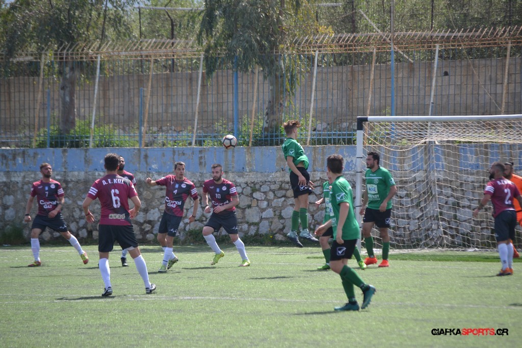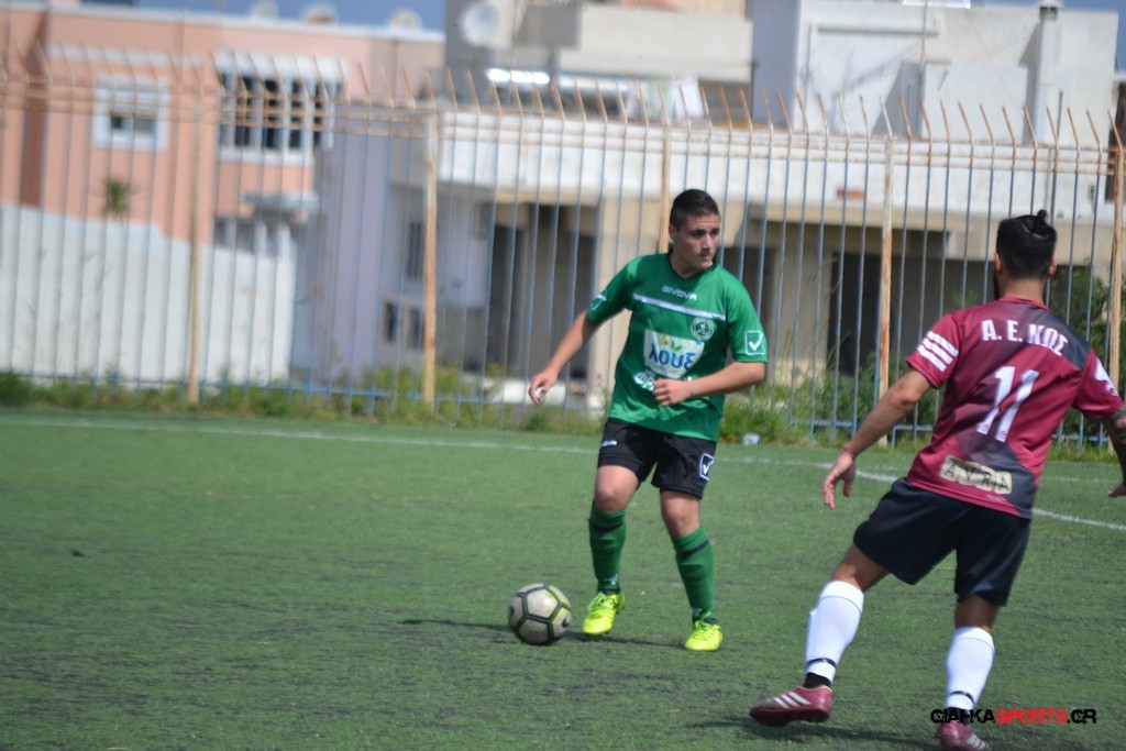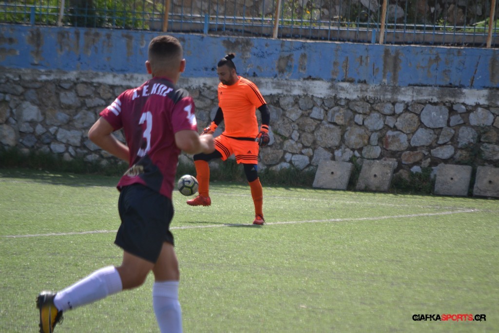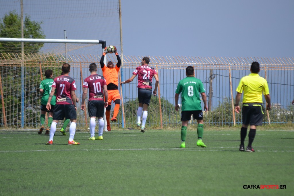 Η Α.Ε Κως είχε τον έλεγχο και την κυκλοφορία και στο 32’ ο Βασιλειάδης με το στήθος έσπρωξε την μπάλα στα δίχτυα κάνοντας το 3-0 για την ομάδα του που ήταν το αποτέλεσμα του πρώτου ημιχρόνου.