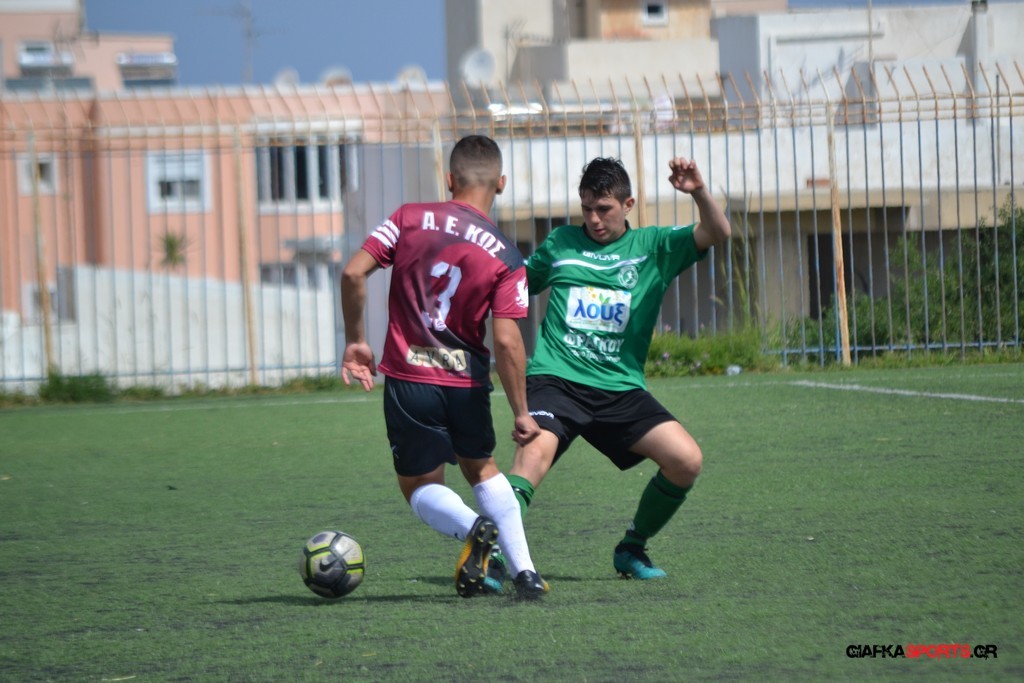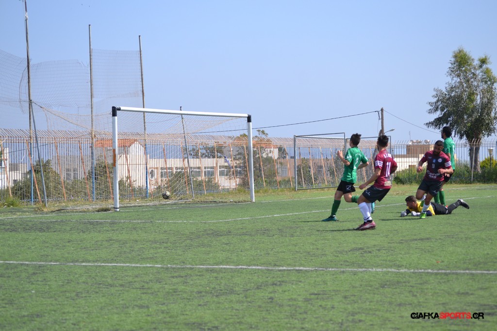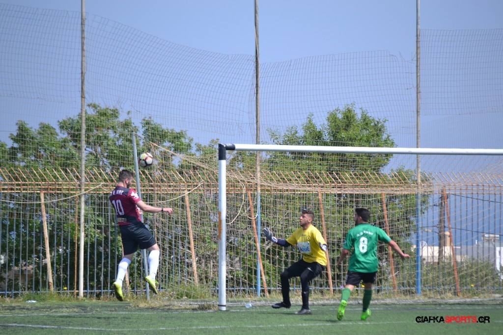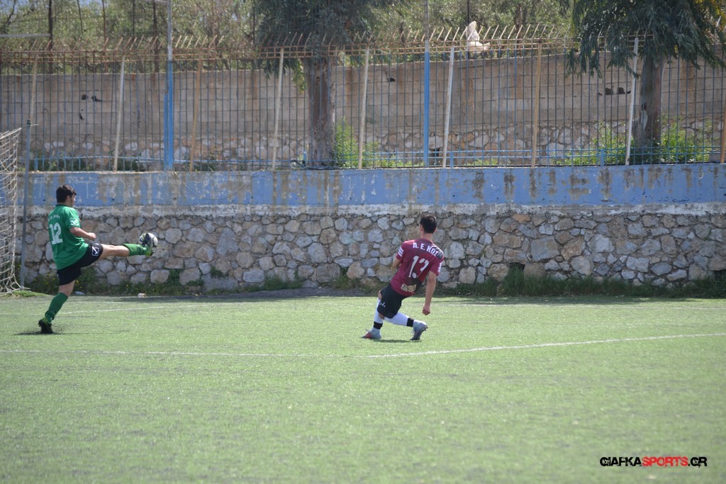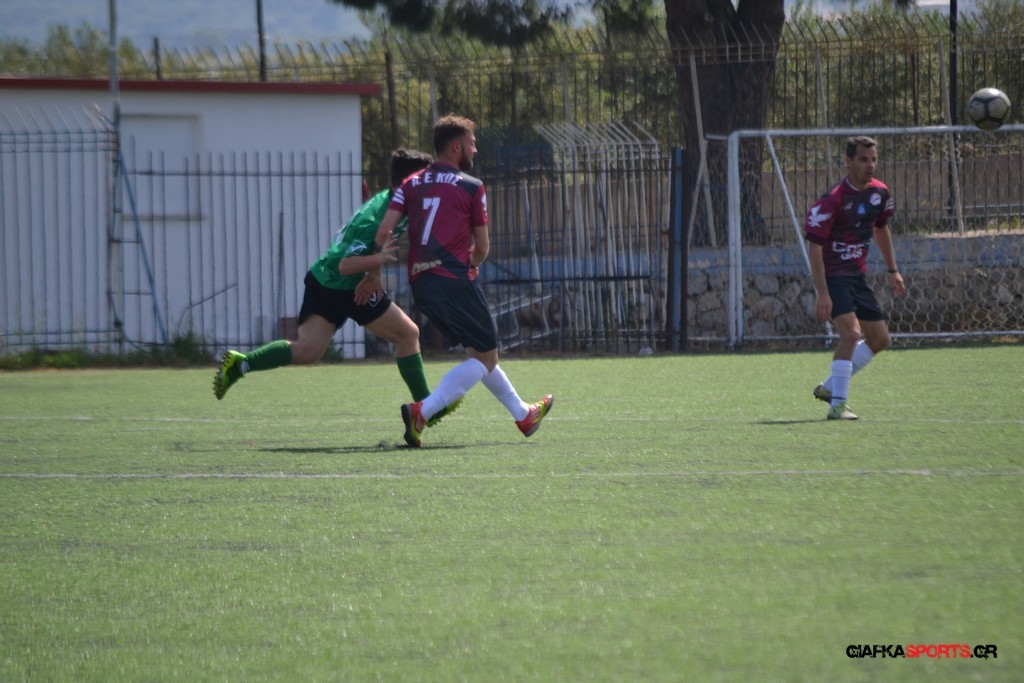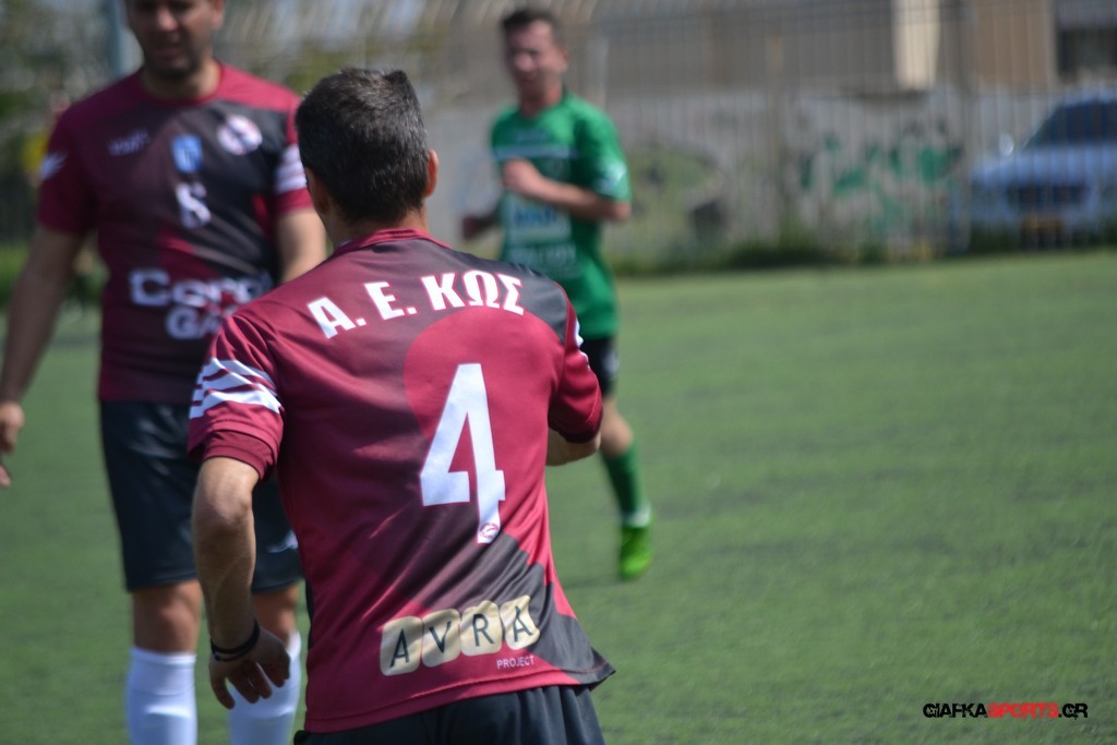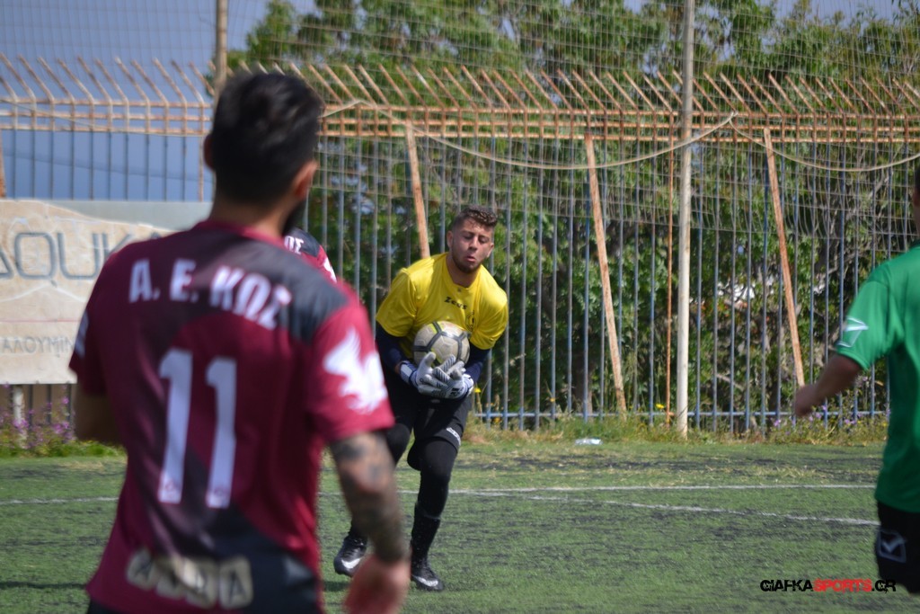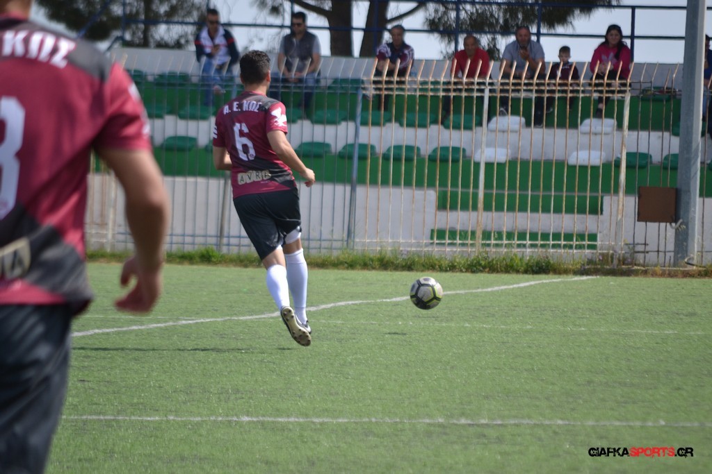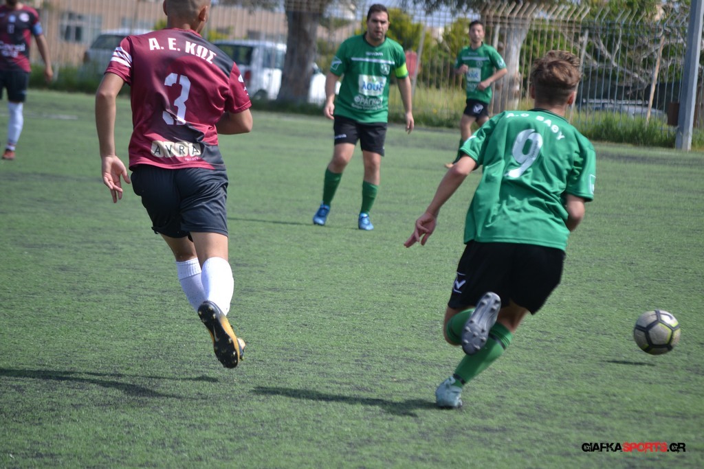 Η Α.Ε Κως είχε τον έλεγχο και την κυκλοφορία και στο 32’ ο Βασιλειάδης με το στήθος έσπρωξε την μπάλα στα δίχτυα κάνοντας το 3-0 για την ομάδα του που ήταν το αποτέλεσμα του πρώτου ημιχρόνου.