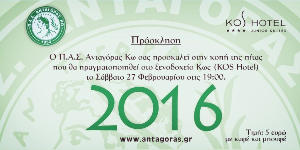 Ο Π.Α.Σ. Ανταγόρας Κω σας προσκαλεί στην κοπή της πίτας, εκδήλωση που πρόκειται να πραγματοποιηθεί στο ξενοδοχείο ΚΩΣ (KOS HOTEL),το Σάββατο 27 Φεβρουαρίου 2016 και ώρα 19:00.