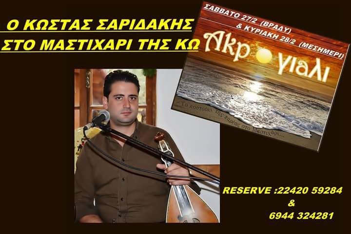Αυτό το Σαββατοκύριακο κινούμαστε σε ρυθμούς Κρήτης. Ο Κώστας Σαριδάκης και η παρέα του έρχονται με διάθεση να μας ξεσηκώσουν στο “Ακρογιάλι” στο Μαστιχάρι.