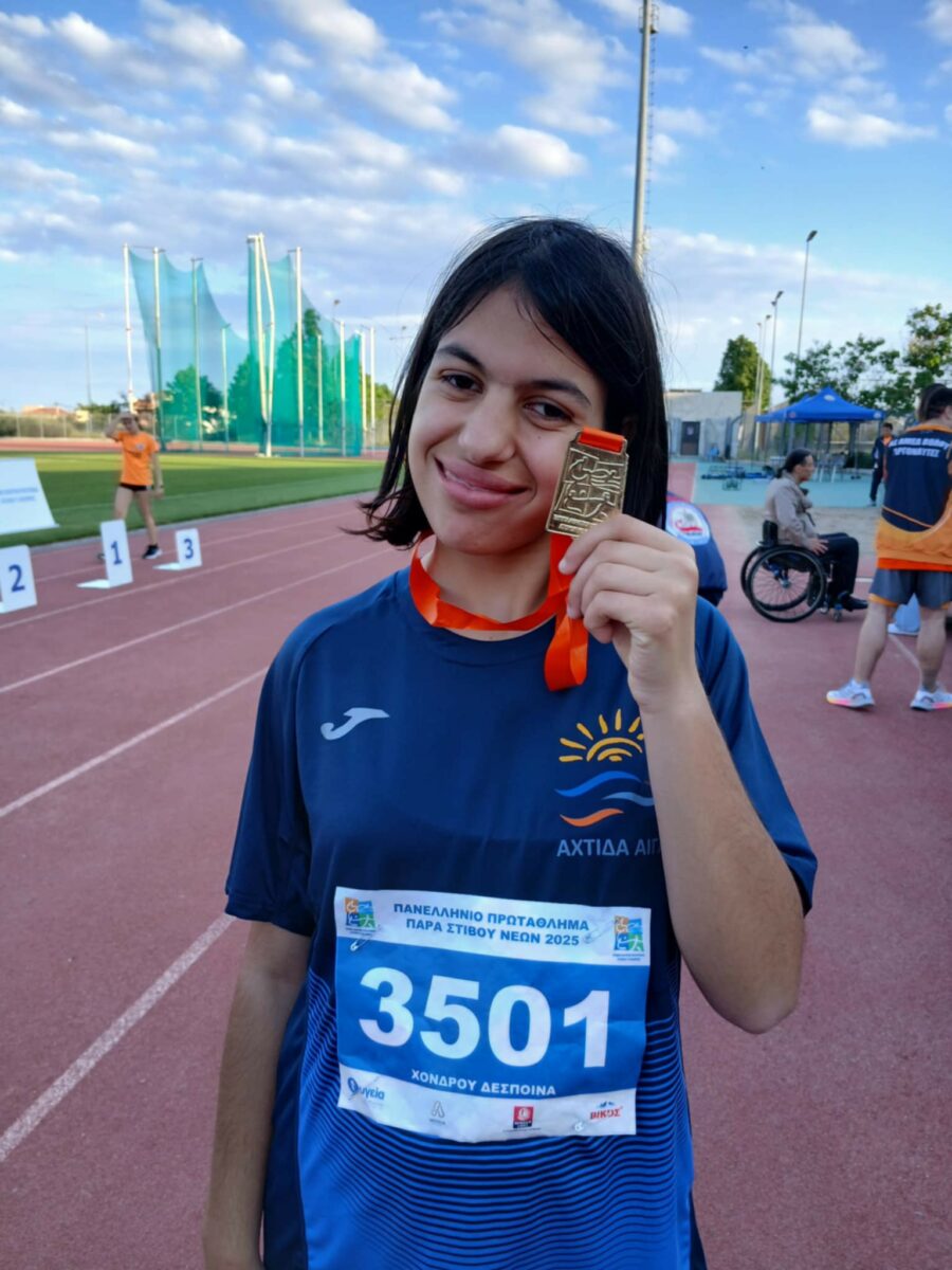 Εξαιρετική ήταν για ακόμη μια φορά η Δέσποινα Χόνδρου που διέπρεψε στους Πανελλήνιους αγώνες παρά στίβου που πραγματοποιήθηκαν στον Βόλο. Αγωνιζόμενη με το σωματείο Αχτίδα Αιγαίου – Μυτιλήνης και υπό την καθοδήγηση του Κώστα Χατζηδαυίδ που είναι δίπλα της σε όλα της τα βήματα η Δέσποινα κατάφερε να κατακτήσει τρία χρυσά μετάλλια και ένα ασημένιο κάνοντας και Πανελλήνια ρεκόρ στα 400 και στα 800 μέτρα.