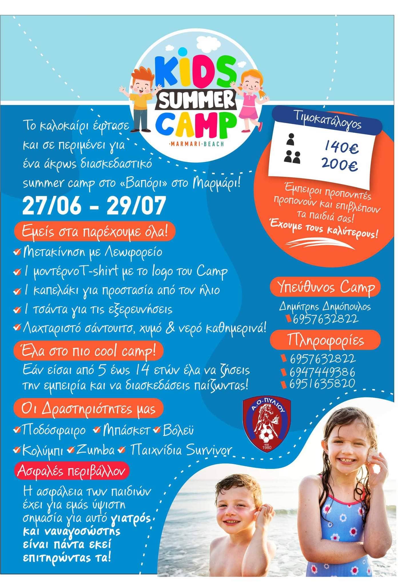 Σε πλήρη εξέλιξη βρίσκονται οι εγγραφές για το Kids Summer Camp στην παραλία Βαπόρι στο Μαρμάρι με υπεύθυνo τον Δημήτρη Δημόπουλο σε συνεργασία με την ομάδα του Α.Ο Πυλίου.