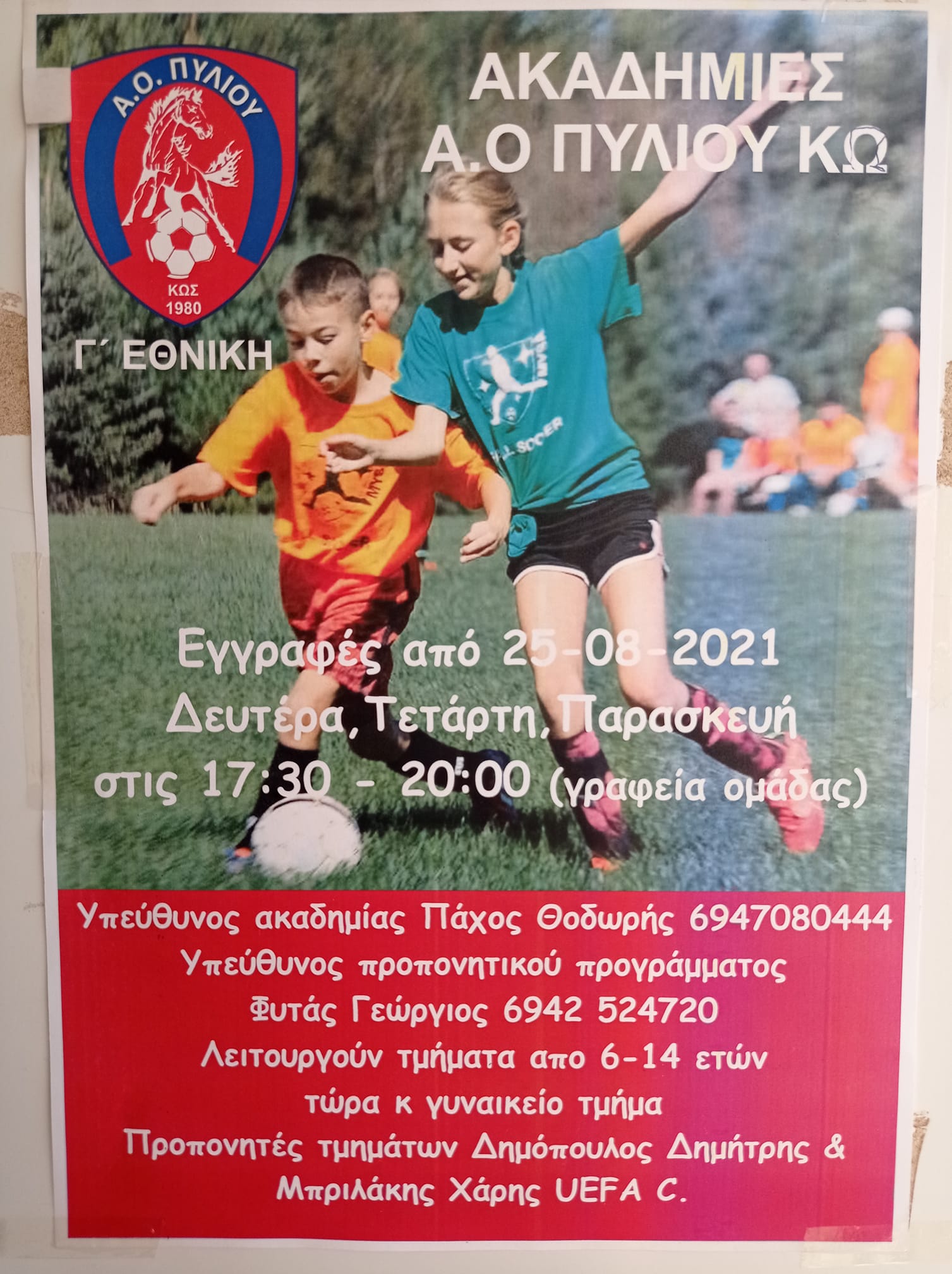 Σε πλήρη εξέλιξη βρίσκονται απ’ το τέλος Αυγούστου οι εγγραφές στις ακαδημίες του Α.Ο Πυλίου. Την φετινή χρονιά προπονητές της ομάδας θα είναι οι Δημήτρης Δημόπουλος και Χάρης Μπριλάκης ενώ υπεύθυνος του προπονητικού προγράμματος θα είναι ο Γιώργος Φυτάς.