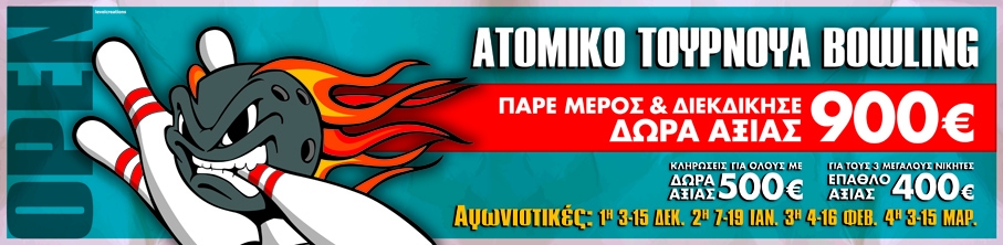 Ξεκίνησε την Δευτέρα 3/12 το Ατομικό τουρνουά Ten Pin bowling Open το οποίο θα έχει διάρκεια 4 αγωνιστικών. Τα προκριματικά της 1ης αγωνιστικής θα διεξαχθούν από 3/12 μέχρι την παρασκευή 14/12 και ο τελικός το Σάββατο στις 15/12. Η 2η αγωνιστική θα διεξαχθεί στις 7-19 Ιανουαρίου,η 3η στις 4-16 φεβρουαρίου και η 4η στις 3-15 Μαρτίου.Δικαίωμα συμμετοχής στο τουρνουά έχουν ολοι οι φιλοι του αθληματος,ενώ για τις κατηγορίες Γυναικών, Junior και όλων των νέων παικτών θα δίνεται handicap 15 κορίνες ανά παιχνιδι. Τα επαθλα του τουρνουά θα είναι δώρα αξίας 900€ ,400€ για τους 3 πρώτους νικητές του τουρνουά, ενώ για όσους παρουν μέρος στο τουρνουά θα μοιραστούν δώρα αξίας 500€ μετά απο κλήρωση.