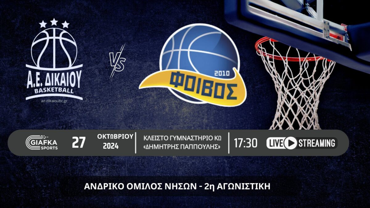 Για την 2η αγωνιστική του ανδρικού πρωταθλήματος η Α.Ε Δικαίου αντιμετωπίζει τον Φοίβο την Κυριακή 27 Οκτωβρίου στις 17:30 στο Κλειστό γυμναστήριο Κω «Δημήτρης Παππούλης». Παρακολουθήστε το ματς σε Live Streaming απ’ το giafkasports.gr