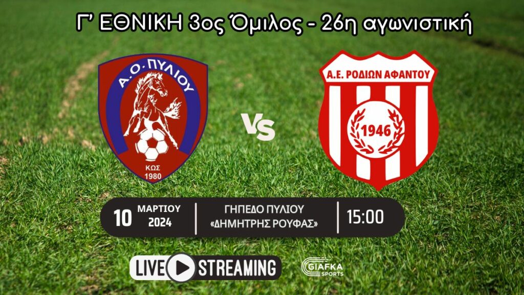 Για την 26η αγωνιστική της Γ’ Εθνικής (3ος Όμιλος) ο Α.Ο Πυλίου υποδέχεται την Α.Ε.Ρ. Αφάντου στο Δημοτικό γήπεδο Πυλίου «Δημήτρης Ρούφας» την Κυριακή 10/3 στις 15:00. Δείτε το ματς σε Live Streaming απ’ το giafkasports.gr