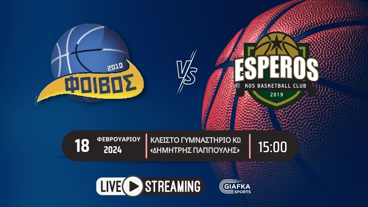 Για την 7η αγωνιστική του Ομίλου νήσων ο Φοίβος υποδέχεται την Κυριακή 18/2  στις 15:00 στο Κλειστό γυμναστήριο Κω «Δημήτρης Παππούλης» τον Έσπερο. Παρακολουθήστε το ματς σε Live Streaming απ’ το giafkasports.gr