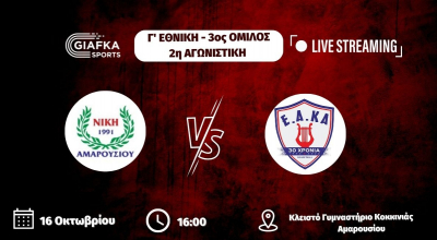 Παρακολουθήστε σε Live Streaming απ’ το giafkasports.gr , απ’ το Κλειστό γυμναστήριο Κοκκινιάς Αμαρουσίου το ματς της 2ης αγωνιστικής για τον 3ο Όμιλο της Γ’ Εθνικής ανάμεσα σε Νίκη Αμαρουσίου και Ε.Α.ΚΑ την Κυριακή 16 Οκτωβρίου στις 16:00.