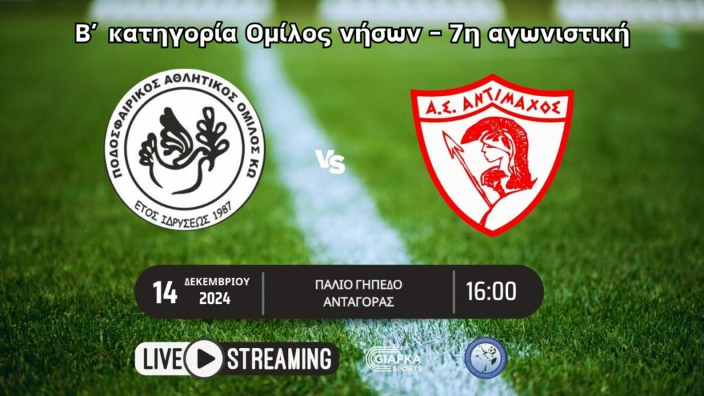 Για την 7η αγωνιστική της Β’ κατηγορίας του Ομίλου νήσων ο ΠΑΟΚ Κω αντιμετωπίζει τον Αντίμαχο στο παλιό γήπεδο Ανταγόρας. Παρακολουθήστε το ματς σε Live Streaming απ’ το giafkasports.gr
