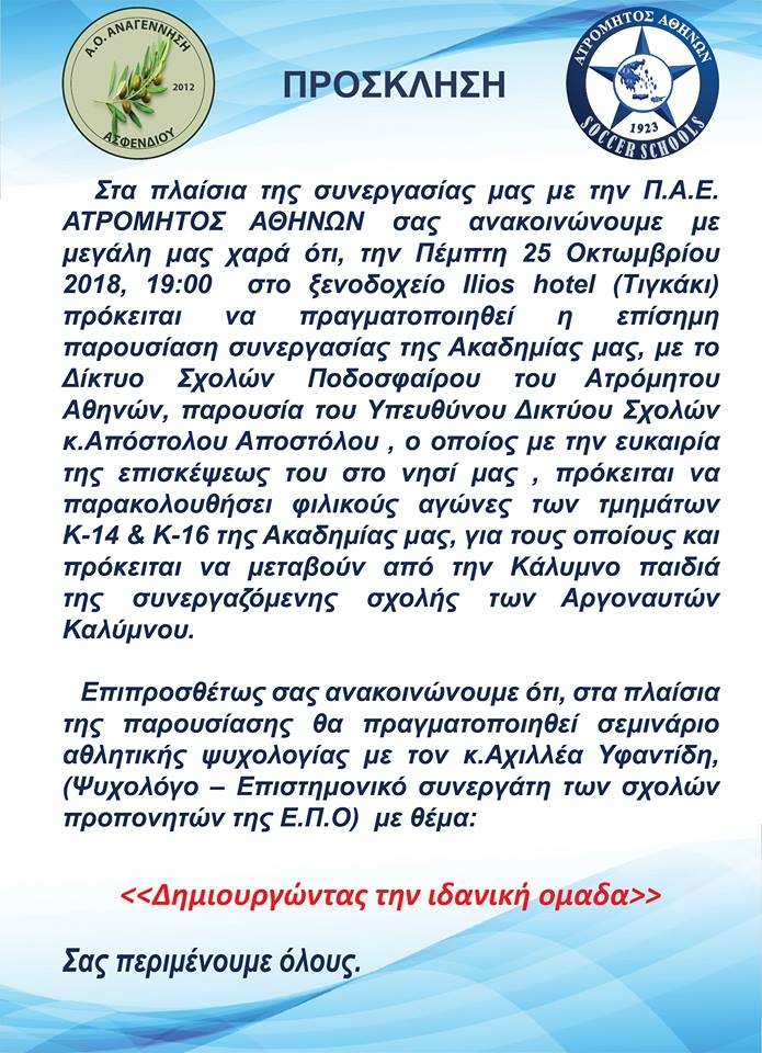 Την Πέμπτη 25 Οκτωβρίου στις 19:00 , στο ξενοδοχείο Ilios Hotel ,σας περιμένουμε όλους στην επίσημη παρουσίαση της συνεργασίας μας με την Π.Α.Ε. Ατρόμητος Αθηνών ,παρουσία του Υπευθύνου Δικτύου σχολών κ.Απόστολου Αποστόλου.