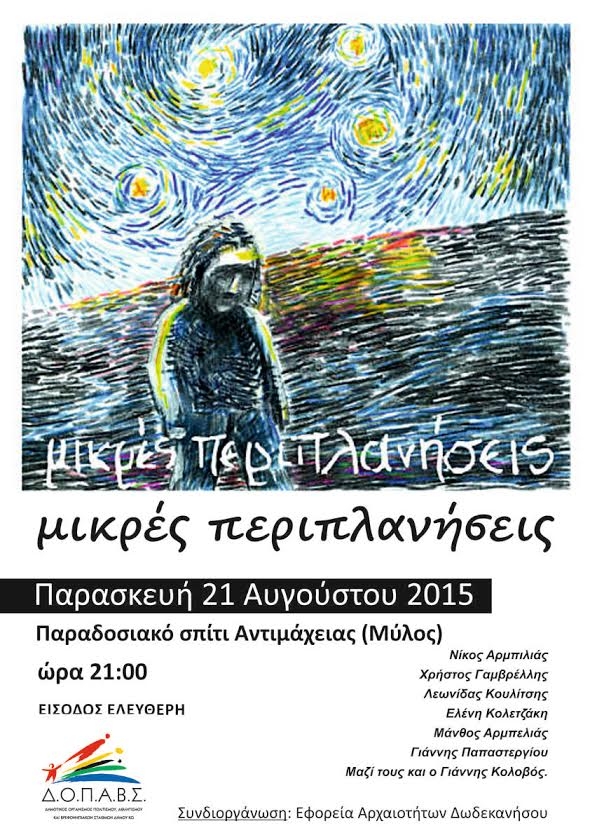 σας προσκαλεί στη Συναυλία με το συγκρότημα «Μικρές Περιπλανήσεις»  την Παρασκευή  21 Αυγούστου 2015,  στο Παραδοσιακό Σπίτι Αντιμάχειας (Μύλος) και ώρα 21:00.