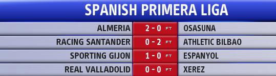 Με νίκες συνέχισαν Σπόρτινγκ Χιχόν, και Μπιλμπάο απέναντι σε Εσπανιόλ και Σαντάντερ.Νίκη για την Αλμερία με 2-0 επι της Οσασούνα ενώ Βαγιαδολίδ και Χερέθ έμειναν στο 0-0.