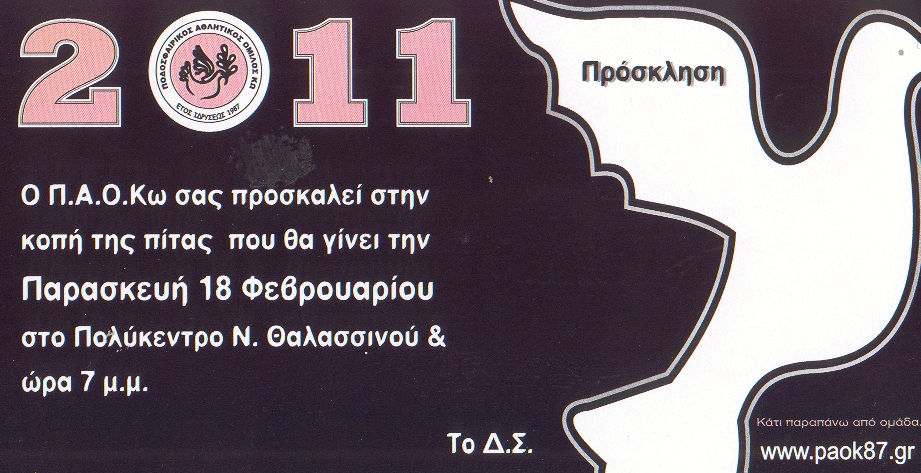 Σήμερα στις 19:00 το απόγευμα ο ΠΑΟΚ Κω κόβει την πίτα την πρωτοχρονιάτικη πίτα του στο Πολύκεντρο Θαλασσινού.Καλούνται όλοι οι αθλητές των τμημάτων με τις οικογένειες τους,οι βετεράνοι,οι φίλοι και τα μέλη να δώσουν το παρών στην γιορτή της ομάδας.