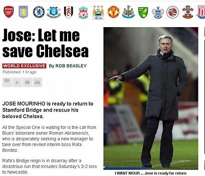 Μάλιστα, ο τίτλος του ρεπορτάζ είναι μια ατάκα του Μουρίνιο: “Ζοσέ: Αφήστε με να σώσω την Τσέλσι”, θέλοντας με αυτό τον τρόπο να δείξει ότι και ο ίδιος ο πολύπειρος τεχνικός θέλει να δουλέψει και πάλι στους Λονδρέζους.