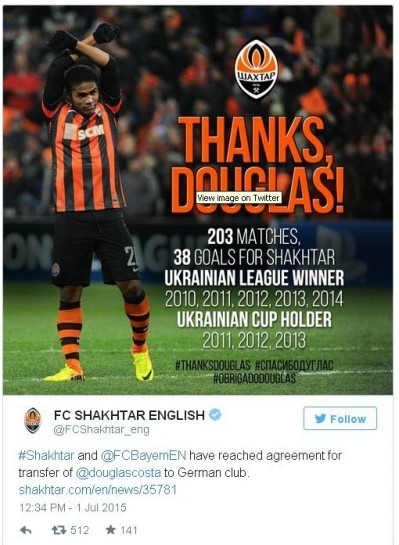 «Σαχτάρ και Μπάγερν Μονάχου συμφώνησαν για την μεταγραφή του Ντάγκλας Κόστα στην γερμανική ομάδα. Το κόστος της μεταγραφής ανέρχεται στα 30 εκατ. ευρώ. Η Σαχτάρ ευχαριστεί τον ποδοσφαιριστή για την προσφορά του και του εύχεται κάθε επιτυχία στην Μπάγερν», αναφέρει χαρακτηριστικά η ανακοίνωση των Ουκρανών.