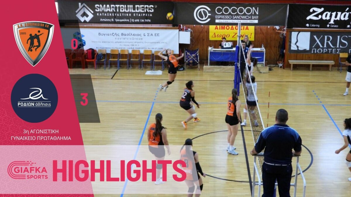 Για την 3η αγωνιστική του γυναικείου πρωταθλήματος το Ροδίων Άθλησις επικράτησε με 0-3 σετ του Α.Ο Αθλοπαιδιών Κω στο Κλειστό γυμναστήριο Κω «Δημήτρης Παππούλης». Δείτε τα highlights απ’ το giafkasports.gr