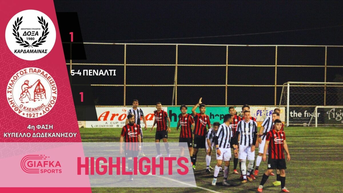 Η Δόξα Καρδάμαινας επικράτησε στην διαδικασία των πέναλτι με 5-4 (1-1 κ.α) του Κλεάνθη Παραδεισίου και πήρε την πρόκριση στα ημιτελικά του θεσμού. Δείτε τα highlights της αναμέτρησης απ’ το giafkasports.gr