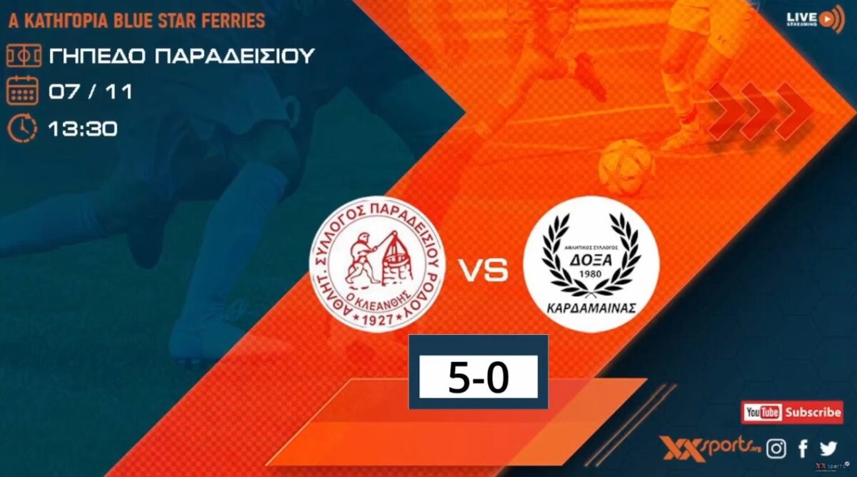 Την ήττα με 5-0 γνώρισε η Δόξα Καρδάμαινας στην Ρόδο απέναντι στον Κλεάνθη Παραδεισίου για την 7η αγωνιστική της Α’ κατηγορίας. Δείτε τα στιγμιότυπα απ’ το xxsports.org
