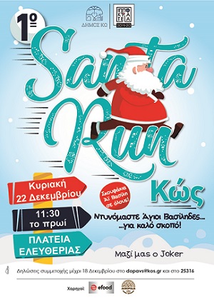Το Τμήμα Πολιτισμού του ΔΟΠΑΒΣ διοργανώνει για πρώτη φορά στην πόλη της Κω το ‘’Santa Run’’ την Κυριακή 22 Δεκεμβρίου στις 11 και μισή το πρωί με σημείο εκκίνησης την πλατεία Ανταγόρα και σημείο τερματισμού στην πλατεία Ελευθερίας.