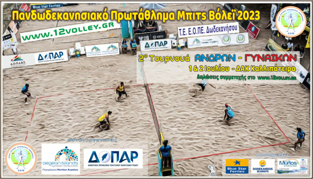 Η Τοπική Επιτροπή Βόλεϊ Δωδεκανήσου διοργανώνει το Σαββατοκύριακο 1 & 2 Ιουλίου το 2ο τουρνουά μπιτς βόλεϊ ανδρών & γυναικών.