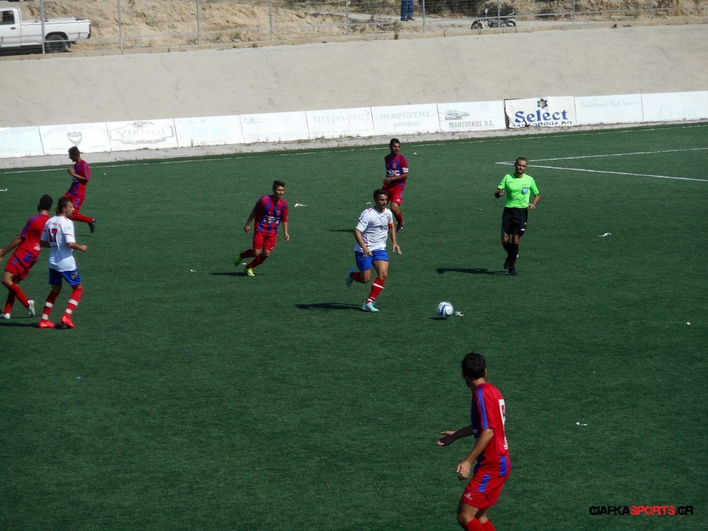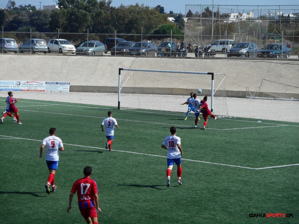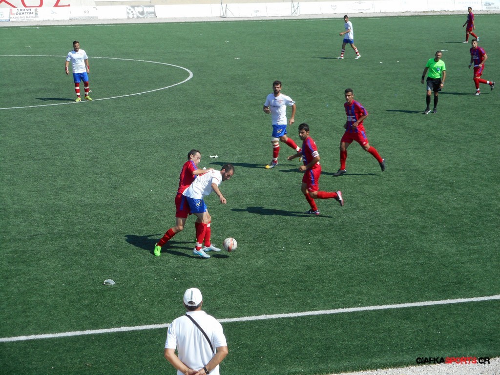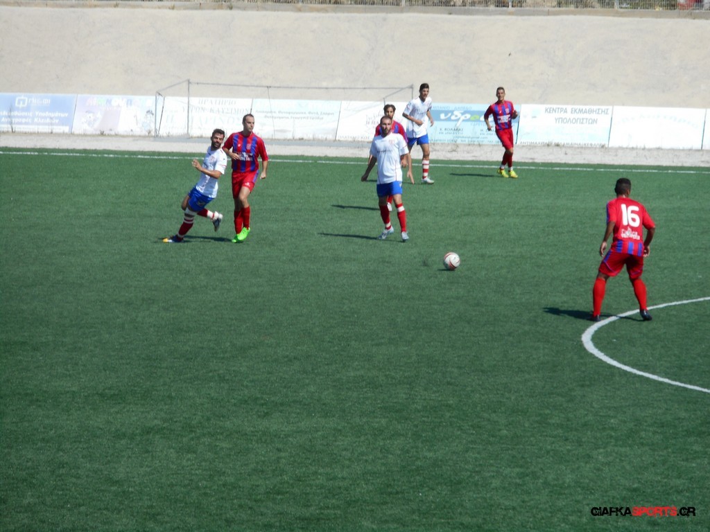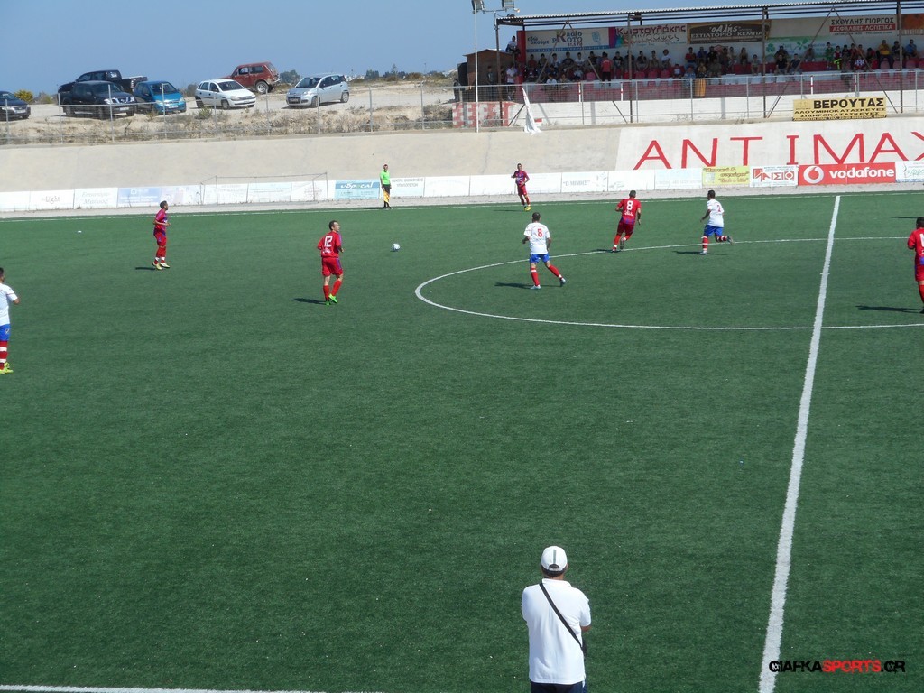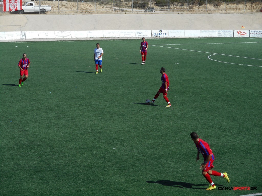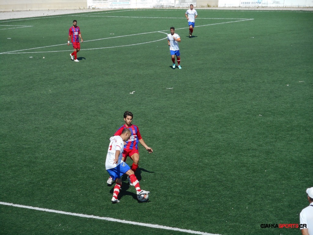 Οι «κόκκινοι» προσπαθώντας απ’ την αρχή απ’ τα πλάγια να επιτεθούν κατάφεραν μόλις στο 12ο λεπτό να πάρουν προβάδισμα στο σκορ όταν ο Χατζησουλεϊμάν έκανε την σέντρα απ’ τα δεξιά και ο Συντιχάκης που κινήθηκε ωραία στο πρώτο δοκάρι έστειλε την μπάλα στα δίχτυα για το 1-0.
