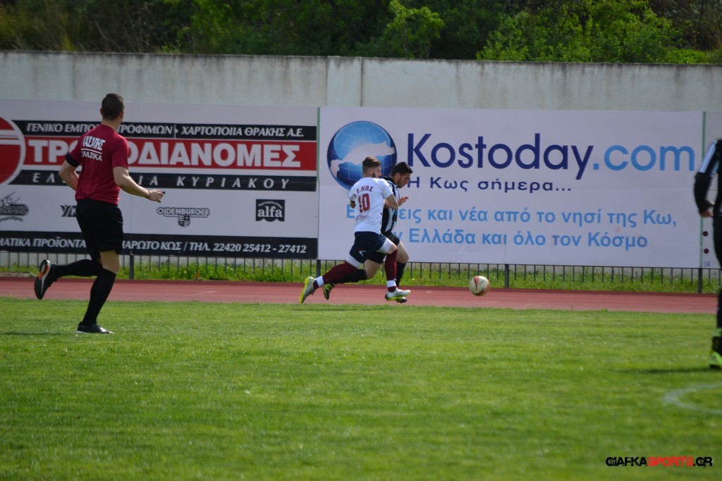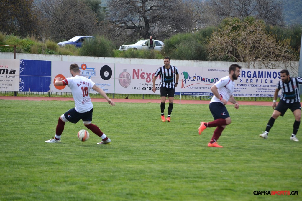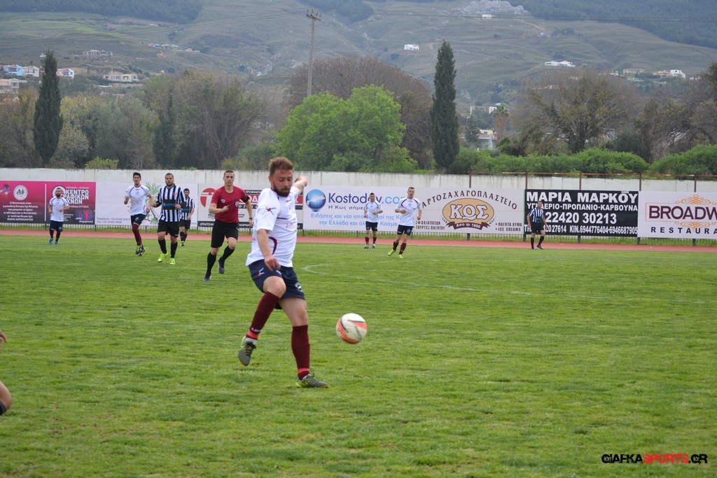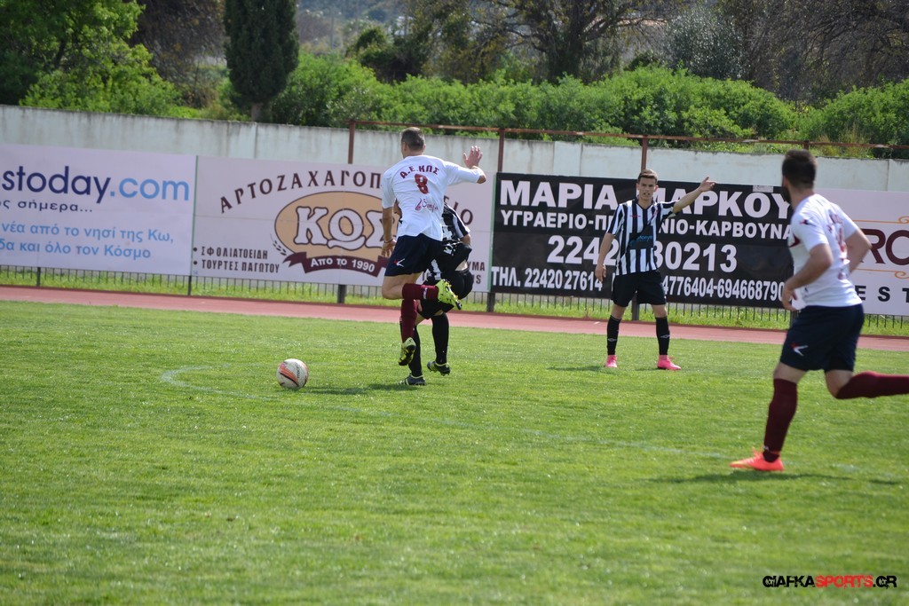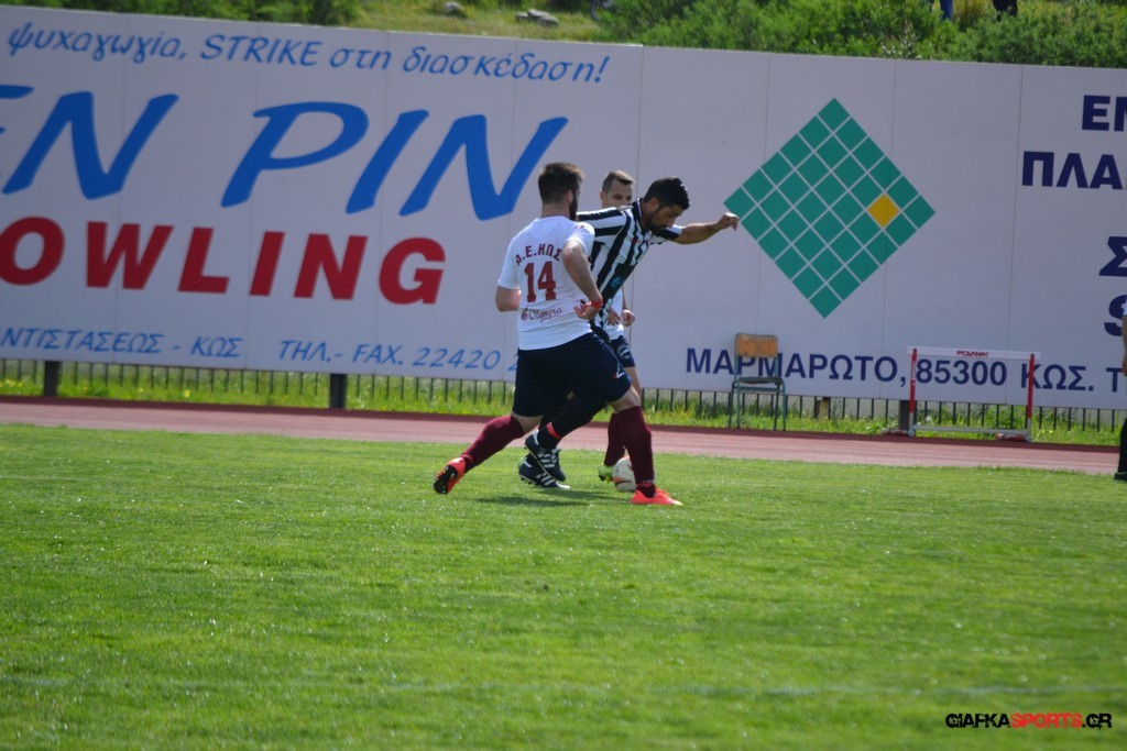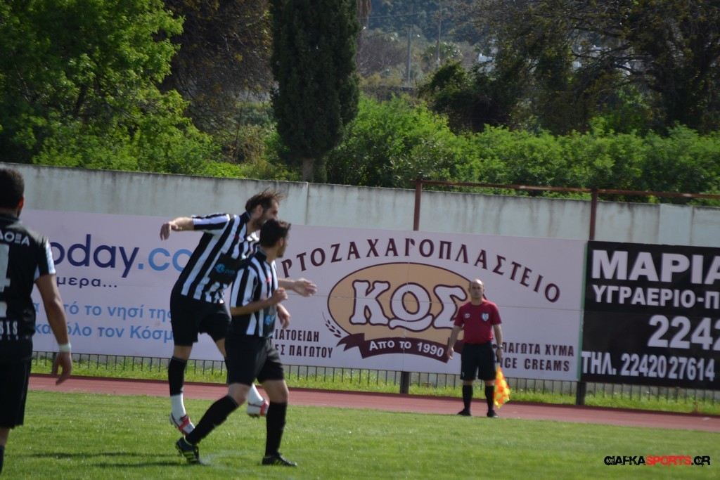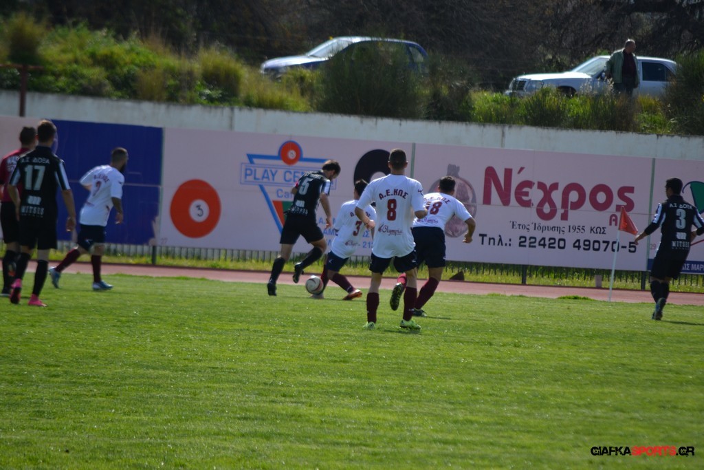 Με την έναρξη του δευτέρου μέρους η Α.Ε Κως που είχε κλείσει πολύ σωστά τους διαδρόμους, κατάφερε να σκοράρει στην κόντρα με τον Ηλιάδη στο 55′ να κάνει την παράλληλη πάσα και τον Κώστογλου να νικά τον Γιακούμαρο για το 1-0.