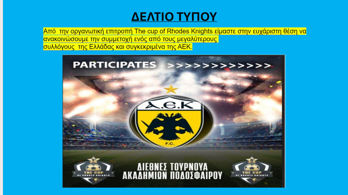 Από  την οργανωτική επιτροπή The cup of Rhodes Knights είμαστε στην ευχάριστη θέση να ανακοινώσουμε την συμμετοχή ενός από τους μεγαλύτερους συλλόγους  της Ελλάδας και συγκεκριμένα της ΑΕΚ.