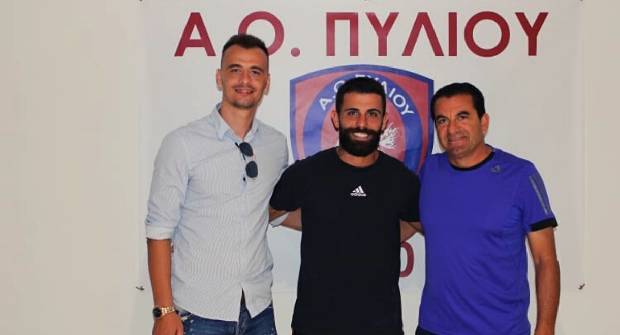 Στη φωτογραφία, ο Ηλιόπουλος με τον εκπρόσωπό του Φώτη Μπάτσι (αριστερά) της Football Building Agency και τον πρόεδρο του Α.Ο Πυλίου Πέτρο Κεφαλιανό.