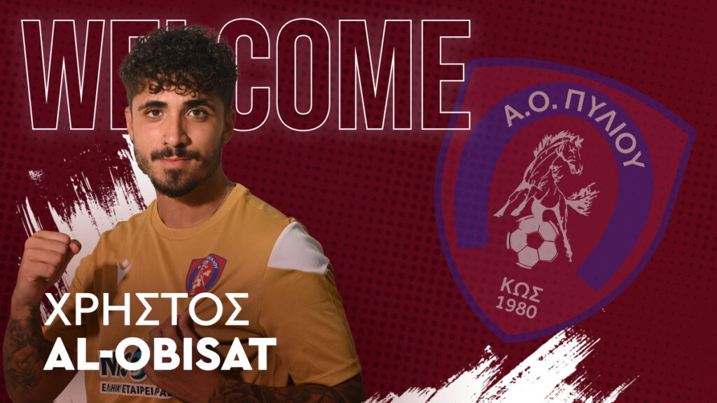 «Ο Α.Ο Πυλίου Κω ανακοινώνει την έναρξη της συνεργασίας με τον ποδοσφαιριστή Χρήστο Al – Obisat για την ποδοσφαιρική περίοδο 2023/24. Ο 23χρονος μεσοεπιθετικός βρίσκεται ήδη στο νησί μας και προπονείται με την ομάδα. Έχει ξεκινήσει την καριέρα του απ’ τον Παναιτωλικό ενώ μεταξύ άλλων έχει αγωνιστεί στον Τηλυκράτη, στον Αίαντα Σαλαμίνας, στην Αλ Σάλτ και τον Παναγρινιακό. Τον καλωσορίζουμε και του ευχόμαστε μια γεμάτη σεζόν χωρίς τραυματισμούς».