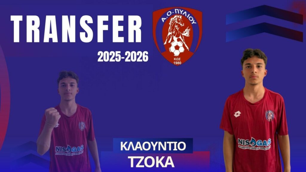 «Ο Α.Ο. Πυλίου ανακοινώνει την επιστροφή του Κλαούντιο Τζόκα στην ομάδα μας για την αγωνιστική περιόδο 2025-2026. Ο νεαρός επιθετικός, ο οποίος είχε αγωνιστεί ξανά με τα χρώματα του συλλόγου μας στο παρελθόν, επιστρέφει μετά από την παρουσία του τα τελευταία χρόνια στον Α.Ο. Αθλοπαιδιών Κω, όπου κατέγραψε σημαντικές εμπειρίες και συνέχισε την ποδοσφαιρική του εξέλιξη. Τον καλωσορίζουμε και πάλι στην οικογένεια του Α.Ο. Πυλίου και του ευχόμαστε υγεία και επιτυχίες με τη φανέλα της ομάδας μας.»