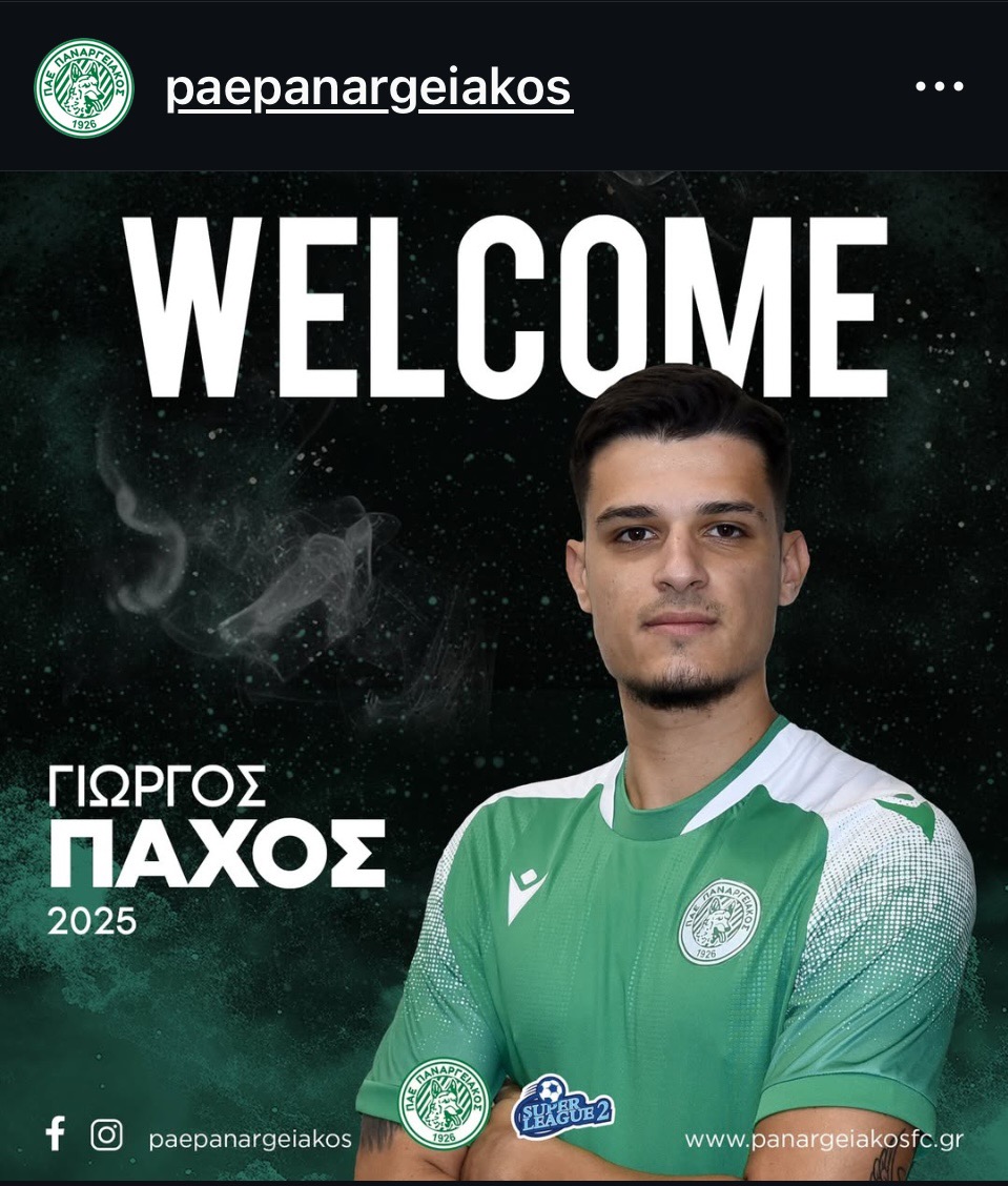 Νέα πρόκληση για την καριέρα του Γιώργου Πάχου αφού ο 20χρονος Κώος μεσοεπιθετικός ανακοινώθηκε απ’ την ομάδα του Παναργειακού που αγωνίζεται στο πρωτάθλημα της Super League 2.