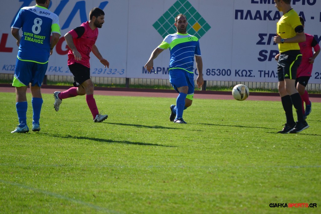 Στο 34′ ο γηπεδούχος ΠΑΟΚ Κω κατάφερε να περάσει μπροστά στο σκορ όταν ο Ξυπολιτάς Μικές βγήκε ωραία στην πλάτη της άμυνας του Α.Ο Βαθύ και σέρβιρε έτοιμο γκολ στον Καπουράνη για το 1-0.Οι φιλοξενούμενοι αντέδρασαν γρήγορα μετά από 2 λεπτά με τον Σαγρέ να βγαίνει πίσω από τους αμυντικούς του ΠΑΟ Κω και αφού πέρασε και τον Κανάνη δεν δυσκολεύτηκε να στείλει την μπάλα στα δίχτυα για το 1-1.