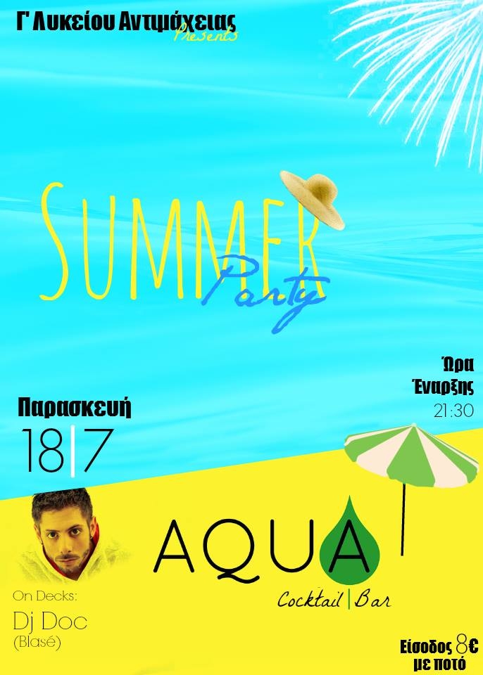 ” Στο ξεκίνημά μας ως Γ΄Λυκείου, σας προσκαλούμε στο πιο δυνατό πάρτι του καλοκαιριού!!! Στις 18/7 σας περιμένουμε όλους στο AQUA Cafe-Bar στις 21:30 για διασκεδάσουμε, να χορέψουμε και να περάσουμε καλά!! Guest star o Dj Doc!!!!! Είσοδος 8 ευρώ με ποτό!!! Να μην λείψει κανείς” !!!