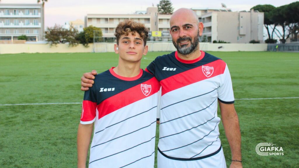 Τα προηγούμενα χρόνια αγωνίστηκε με τον μεγάλο του γιο Δαυίδ που πλέον αγωνίζεται στον Α.Ο Πυλίου ενώ την περασμένη Κυριακή και σήμερα έπαιξε με τον 14χρονο μικρό του γιο Αντρέα που φορά την φανέλα του Αντίμαχου και έχει όλα τα στοιχεία εκείνα που τον κάνουν να ξεχωρίζει παρά το νεαρό της ηλικίας του.