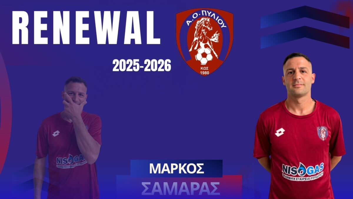 «Ο Α.Ο Πυλίου Κω ανακοινώνει την ανανέωση της συνεργασίας με τον ποδοσφαιριστή, Μάρκο Σαμαρά για την αγνωνιστική περίοδο 2025/2026. Ο σκληροτράχηλος αμυντικός που είναι γέννημα θρέμμα του συλλόγου βοήθησε και φέτος την ομάδα μας και θα παραμείνει στην οικογένεια μας και τη νέα σεζόν. Του ευχόμαστε μια καλή και γεμάτη σεζόν χωρίς τραυματισμούς».